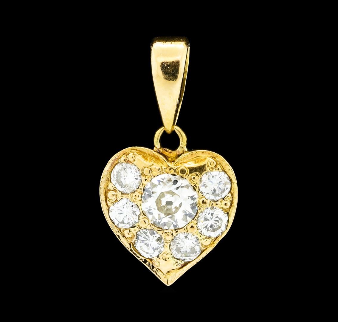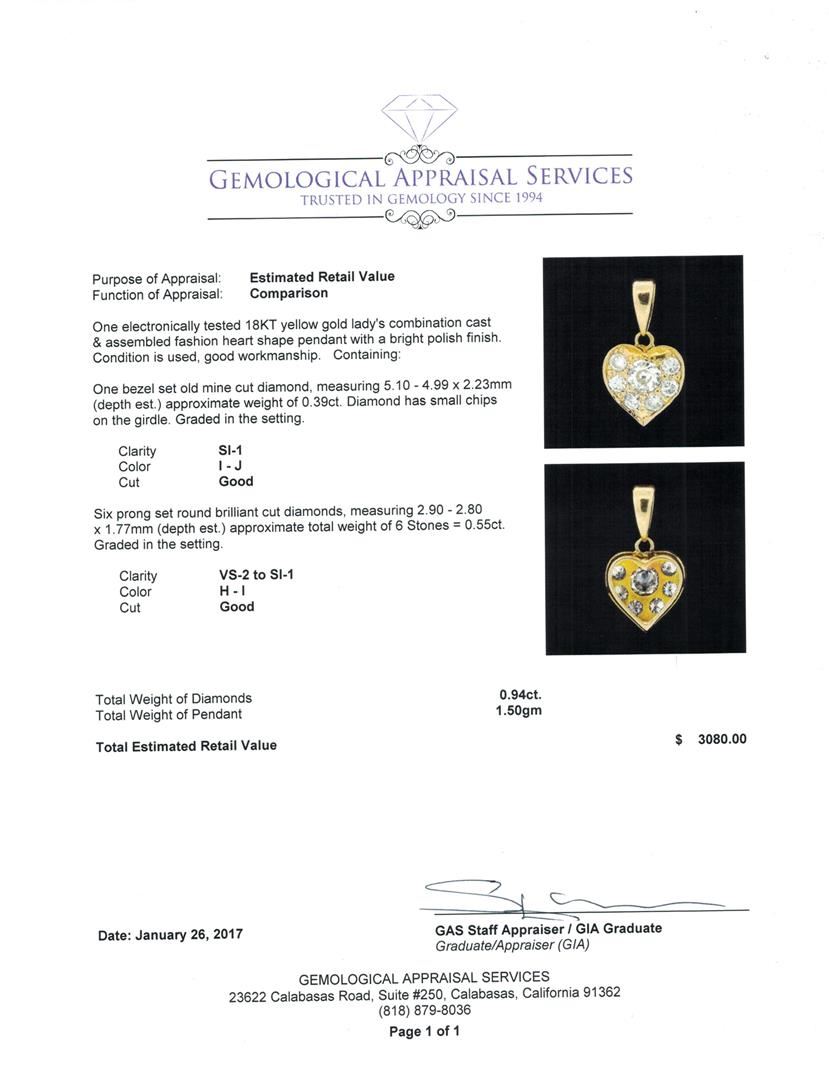 One electronically tested 18KT yellow gold lady's combination cast & assembled fashion heart shape pendant with a bright polish finish. Condition is used, good workmanship. Containing: One bezel set old mine cut diamond, measuring 5.10 - 4.99 x 2.23mm (depth est.) approximate weight of 0.39ct. Diamond has small chips on the girdle. Graded in the setting. Color I - J Clarity SI-1 Cut Good Six prong set round brilliant cut diamonds, measuring 2.90 - 2.80 x 1.77mm (depth est.) approximate total weight of 6 Stones = 0.55ct. Graded in the setting. Color H - I Clarity VS-2 to SI-1 Cut Good. Total Weight of Diamonds 0.94ct.. Total Weight of Pendant 1.50gm. GAS Appraised at $3,080.00.