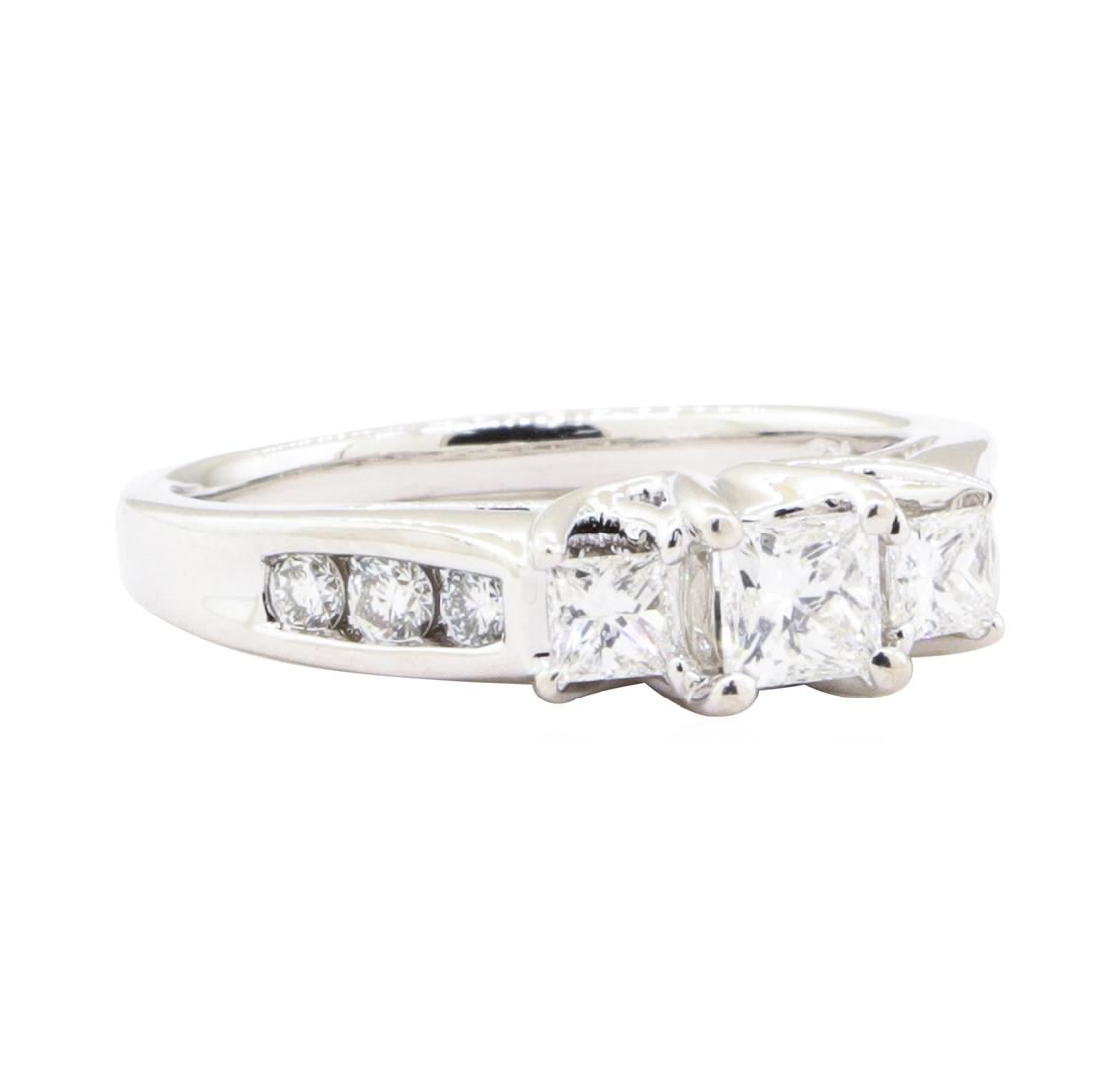 One electronically tested 14KT white gold lady's cast 3-stone fashion ring with a cathedral shank with a bright polish finish. The featured lady's ring has a shank measuring 1.90 millimeters wide. Identified with markings of '14K 585'. Condition is Good. Containing: One prong set princess cut diamond, measuring 3.94 x 3.89 x 2.92mm (depth est.) approximate weight of 0.37ct. Graded in the setting. Color H Clarity SI-1 Cut Very Good Two prong set princess cut diamonds, measuring 2.90 x 2.86 x 2.15mm (depth est.) approximate total weight of 2 Stones = 0.30ct. Graded in the setting. Color G - H Clarity VS-1 to VS-2 Cut Very Good Six channel set round brilliant cut diamonds, measuring 2.40 - 2.20 x 1.38mm (depth est.) approximate total weight of 6 Stones = 0.27ct. Graded in the setting. Color G - H Clarity VS-1 to VS-2 Cut Very Good. Total Weight of Diamonds 0.94ct.. Total Weight of Ring 4.60gm GAS Appraised at $4015.00. GAS Appraised.
