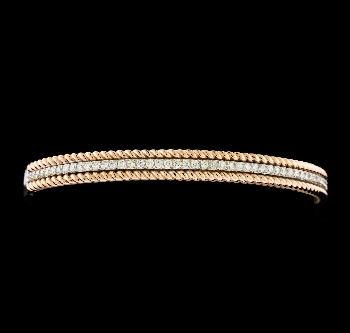 One electronically tested 14KT rose and white gold lady's combination cast & assembled fashion bangle bracelet with a tongue clasp with foldover safety with a bright polish finish. The featured lady's bracelet measures approximately 7 inches in length. Identified with markings of 'K14'. Condition is new, good workmanship. Containing: Fifty prong set round brilliant cut diamonds, measuring 1.75 - 1.65 x 1.05mm (depth est.) approximate total weight of 50 Stones = 0.95ct. Graded in the setting. Clarity SI-1 to I-1. Color: G - I Cut Good. Total Weight of Diamonds 0.95ct.. Total Weight of Bangle Bracelet 18.40gm. GAS Appraised.