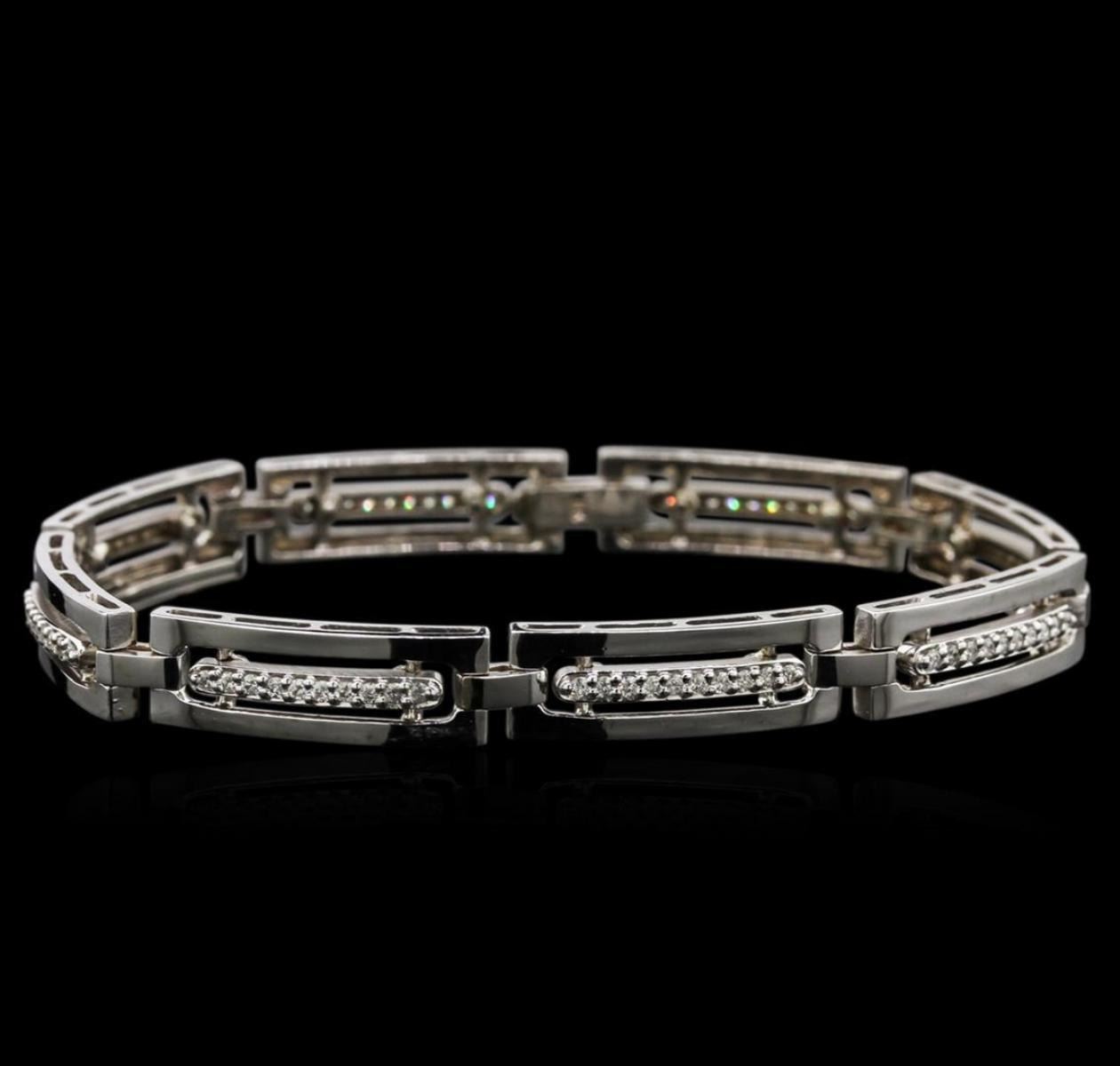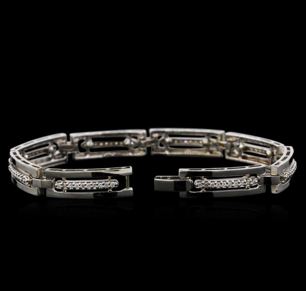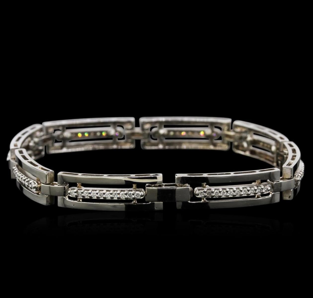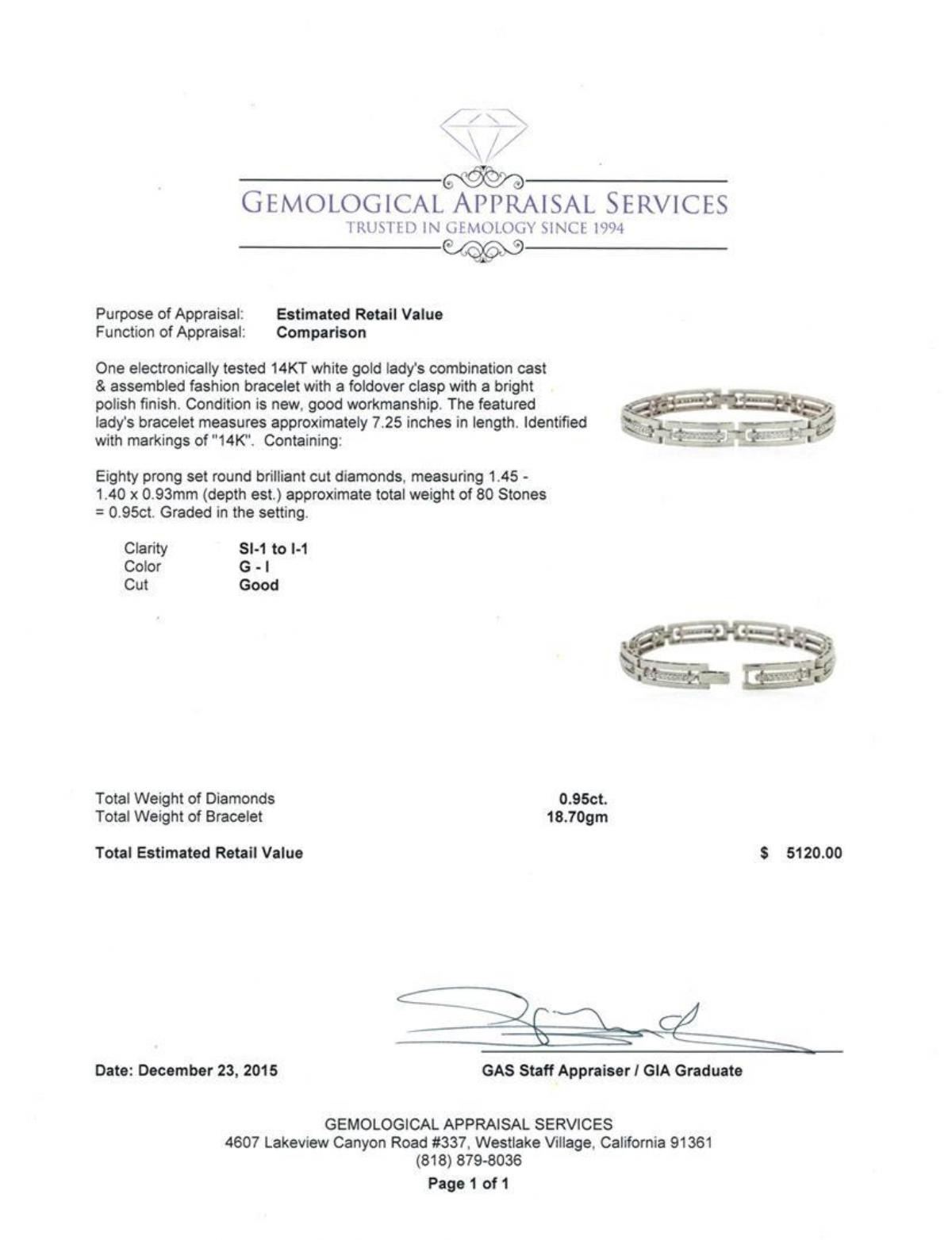 One electronically tested 14KT white gold lady's combination cast & assembled fashion bracelet with a foldover clasp with a bright polish finish. The featured lady's bracelet measures approximately 7.25 inches in length. Identified with markings of "14K". Condition is new, good workmanship. Containing: Eighty prong set round brilliant cut diamonds, measuring 1.45 - 1.40 x 0.93mm (depth est.) approximate total weight of 80 Stones = 0.95ct. Graded in the setting. Clarity: SI-1 to I-1. Color: G - I. Cut Good. Total Weight of Diamonds 0.95ct. Total Weight of Bracelet 18.70gm. GAS Appraised.