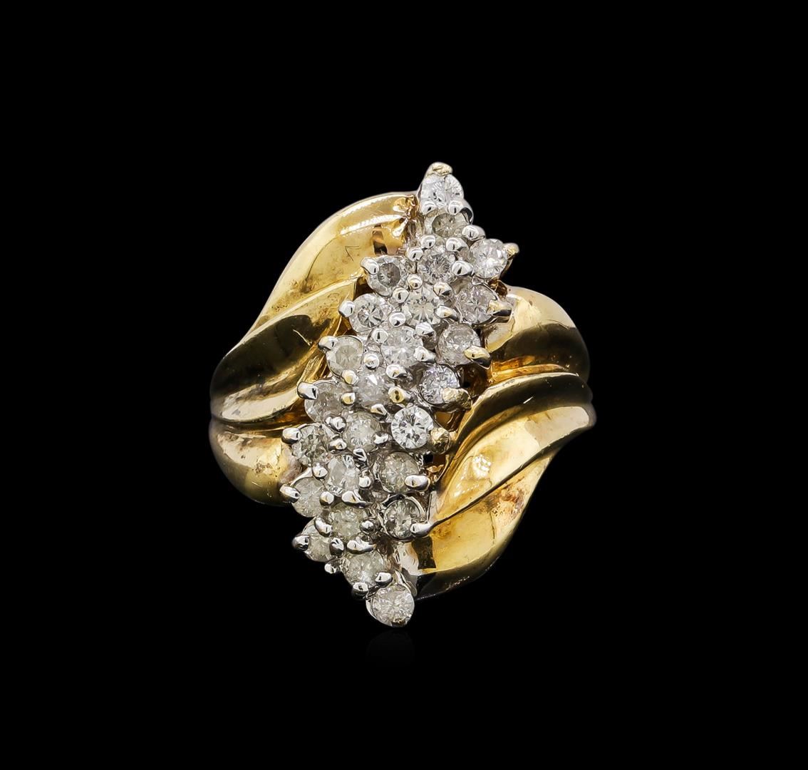 One electronically tested 10KT yellow gold ladies cast diamond ring. The ring features a cascading diamond cluster supported by scalloped shoulders, completed by a two millimeter wide band. Bright polish finish with rhodium accents. Identified with markings of "10K". Condition is good. Containing: Twenty-Five prong set round brilliant cut diamonds, measuring 2.20 - 2.00 x 1.26mm (depth est.) approximate total weight of 25 Stones = 0.95ct. Graded in the setting. Clarity: I-2 to I-3. Color: I - K. Total Weight of Diamonds 0.95ct. Total Weight of Ring 6.45 grams. AIG Appraised.