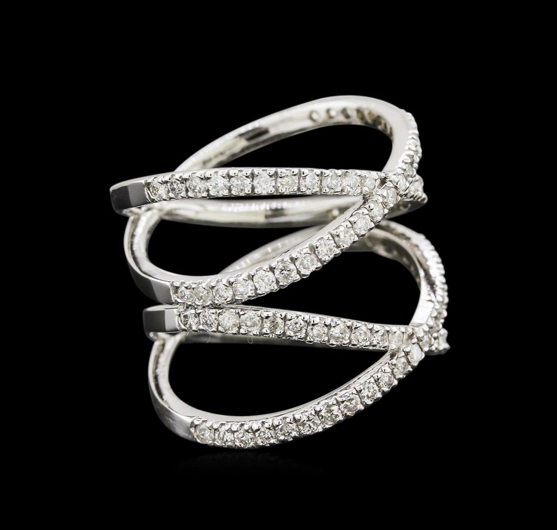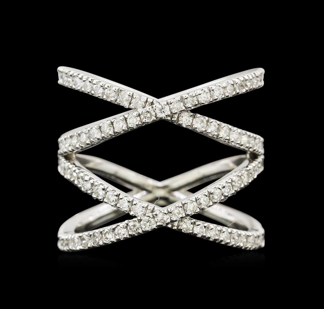 One electronically tested 14KT white gold lady's combination cast & assembled fashion ring with a split shank with a bright polish finish. The featured lady's ring has a double band crossover motif with a shank measuring 10.69 millimeters wide. Identified with markings of "K14". Condition is new, good workmanship. Containing: Ninety-Four prong set round brilliant cut diamonds, measuring 1.40 - 1.35 x 0.88mm (depth est.) approximate total weight of 94 Stones = 0.95ct. Graded in the setting. Clarity: SI-2 to I-1. Color: H - I. Cut Good. Total Weight of Diamonds 0.95ct. Total Weight of Ring 5.30gm. GAS Appraised.