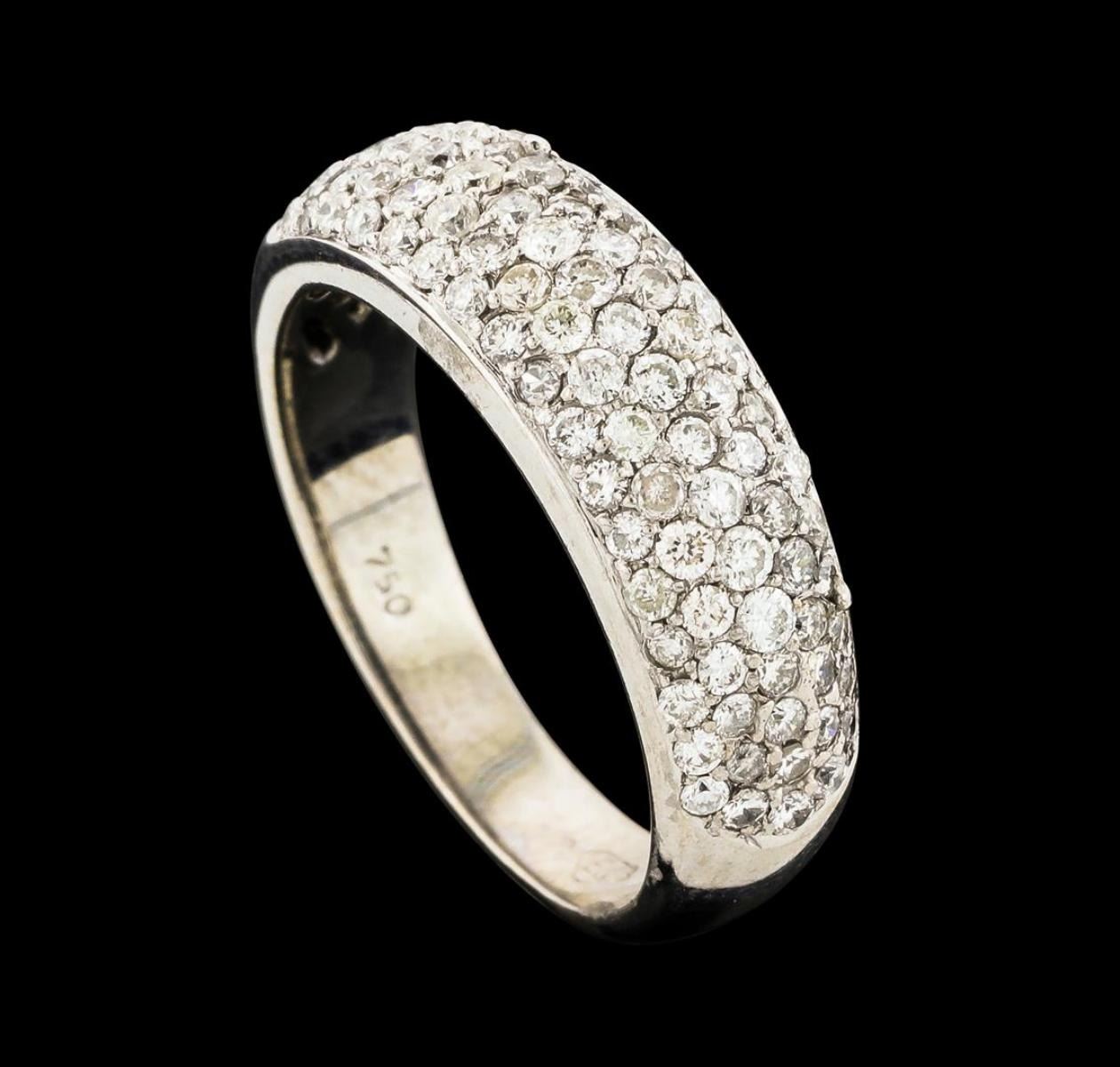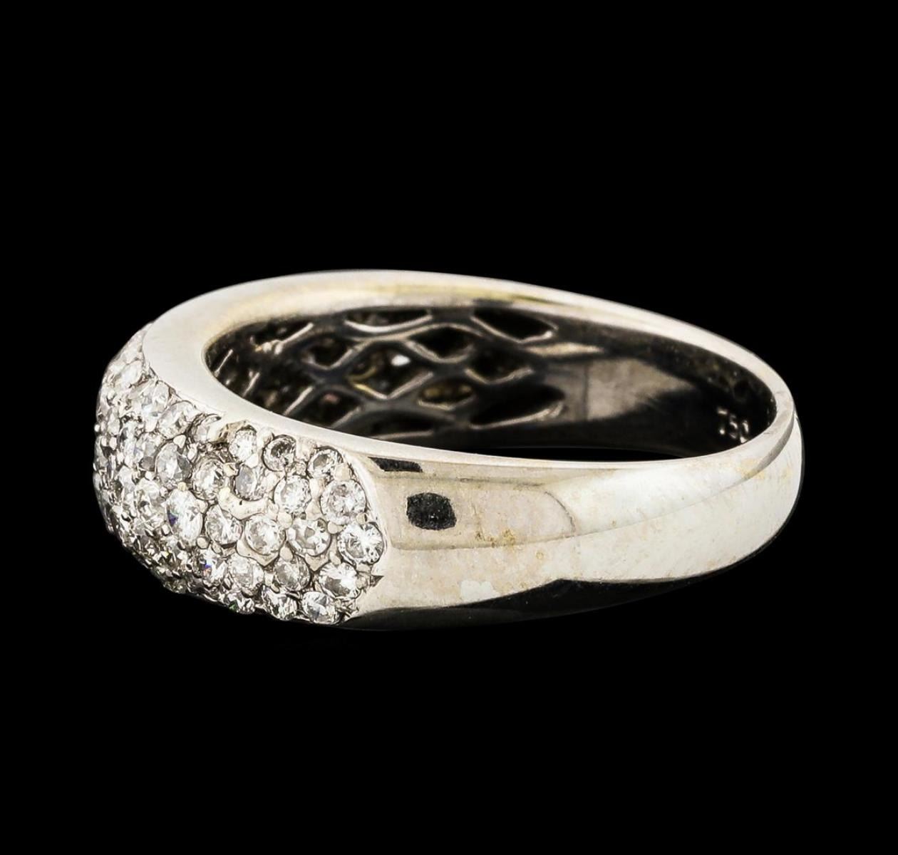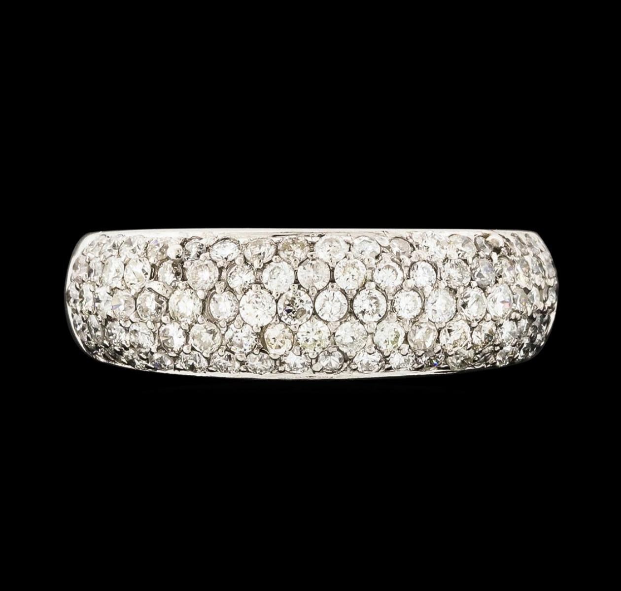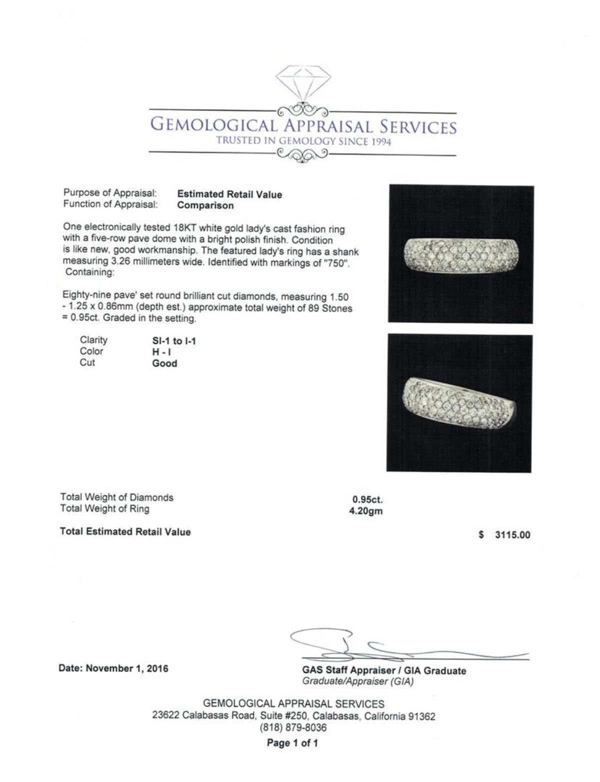 One electronically tested 18KT white gold lady's cast fashion ring with a five-row pave dome with a bright polish finish. The featured lady's ring has a shank measuring 3.26 millimeters wide. Identified with markings of '750'. Condition is like new, good workmanship. Containing: Eighty-Nine pave' set round brilliant cut diamonds, measuring 1.50 - 1.25 x 0.86mm (depth est.) approximate total weight of 89 Stones = 0.95ct. Graded in the setting. Clarity SI-1 to I-1. Color: H - I Cut Good. Total Weight of Diamonds 0.95ct.. Total Weight of Ring 4.20gm. GAS Appraised.