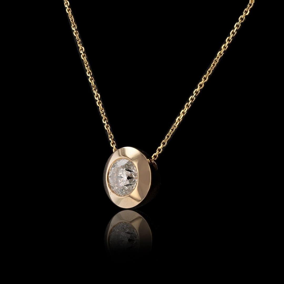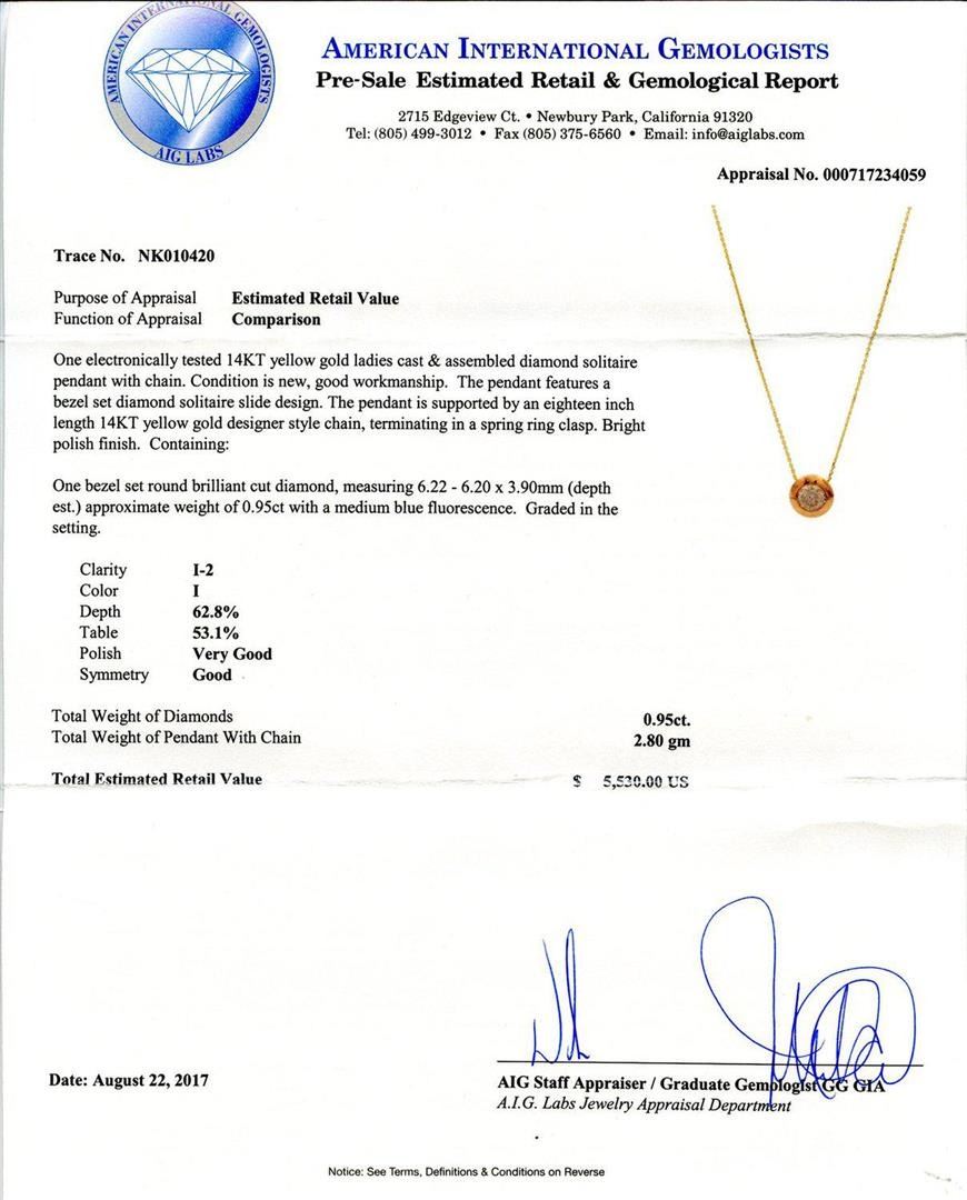 0.95ct Diamond Solitaire 14K Yellow Gold Pendant/Necklace. One electronically tested 14KT yellow gold ladies cast & assembled diamond solitaire pendant with chain. Condition is new, good workmanship. The pendant features a bezel set diamond solitaire slide design. The pendant is supported by an eighteen inch length 14KT yellow gold designer style chain, terminating in a spring ring clasp. Bright polish finish. Containing: One bezel set round brilliant cut diamond, measuring 6.22 - 6.20 x 3.90mm (depth est.) approximate weight of 0.95ct with a medium blue fluorescence. Graded in the setting. Clarity I-2 Color I Depth 62.8% Table 53.1% Polish Very Good Symmetry Good Total Weight of Diamonds 0.95ct. Total Weight of Pendant With Chain 2.80 gm