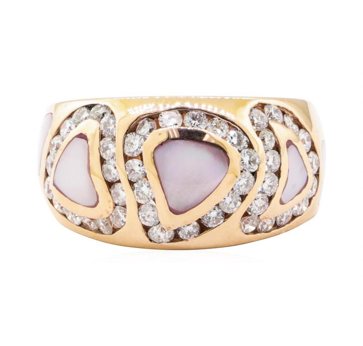 One electronically tested 14KT rose gold lady's cast fashion ring with a tapered wide band with dome with a bright polish finish. The featured lady's ring has five pieces of inlaid mother of pearl and a shank measuring 5.60 millimeters wide. Identified with markings of '14K'. Condition is new, good workmanship. Containing: Forty-Four channel set round brilliant cut diamonds, measuring 1.85 - 1.80 x 1.10mm (depth est.) approximate total weight of 44 Stones = 0.95ct. Graded in the setting. Color G - H Clarity SI-1 to SI-2 Cut Very Good. Total Weight of Diamonds 0.95ct.. Total Weight of Ring 9.00gm GAS Appraised at $4130.00. GAS Appraised.