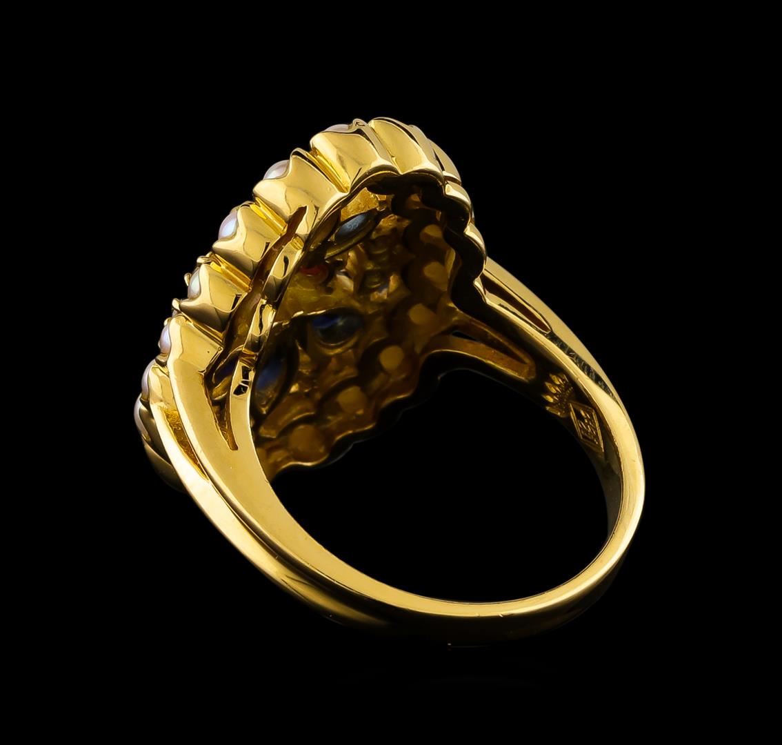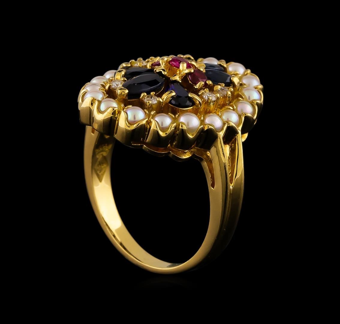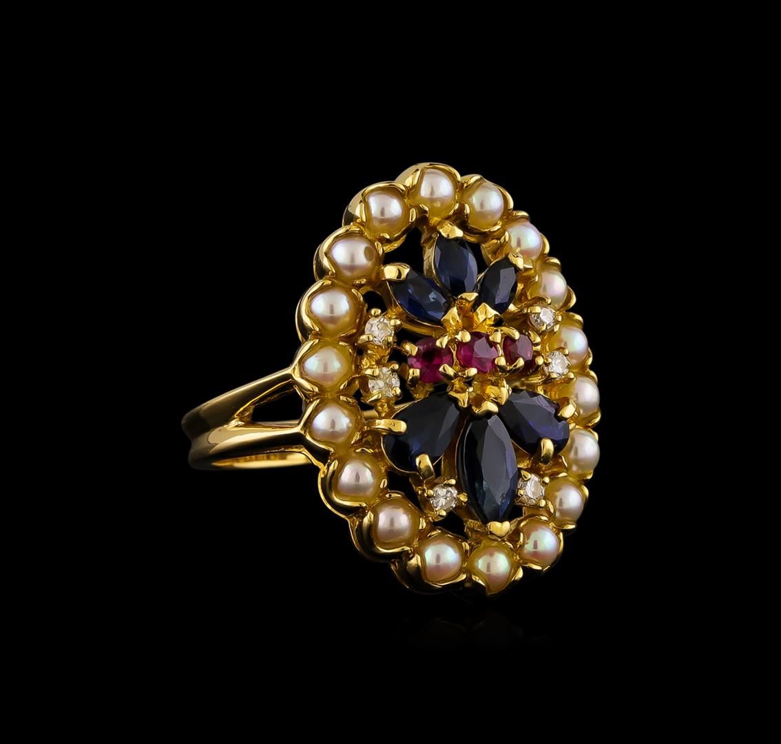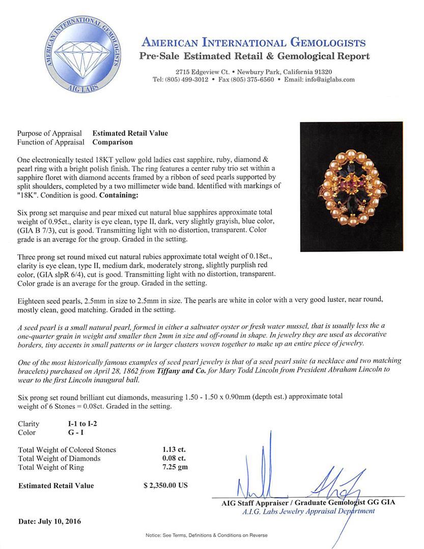 One electronically tested 18KT yellow gold ladies cast sapphire, ruby, diamond & pearl ring with a bright polish finish. The ring features a center ruby trio set within a sapphire floret with diamond accents framed by a ribbon of seed pearls supported by split shoulders, completed by a two millimeter wide band. Identified with markings of "18K". Condition is good. Containing: Six prong set marquise and pear mixed cut natural blue sapphires approximate total weight of 0.95ct., clarity is eye clean, type II, dark, very slightly grayish, blue color, (GIA B 7/3), cut is good. Transmitting light with no distortion, transparent. Color grade is an average for the group. Graded in the setting. Three prong set round mixed cut natural rubies approximate total weight of 0.18ct., clarity is eye clean, type II, medium dark, moderately strong, slightly purplish red color, (GIA slpR 6/4), cut is good. Transmitting light with no distortion, transparent. Color grade is an average for the group. Graded in the setting. Eighteen seed pearls, 2.5mm in size to 2.5mm in size. The pearls are white in color with a very good luster, near round, mostly clean Graded in the setting. A seed pearl is a small natural pearl, formed in either a saltwater oyster or fresh water mussel, that is usually less the a one-quarter grain in weight and smaller then 2mm in size and off-round in shape. In jewelry they are used as decorative borders, tiny accents in small patterns or in larger clusters woven together to make up an entire piece of jewelry. One of the most historically famous examples of seed pearl jewelry is that of a seed pearl suite (a necklace and two matching bracelets) purchased on April 28, 1862 from Tiffany and Co. for Mary Todd Lincoln from President Abraham Lincoln to wear to the first Lincoln inaugural ball. Six prong set round brilliant cut diamonds, measuring 1.50 - 1.50 x 0.90mm (depth est.) approximate total weight of 6 Stones = 0.08ct. Graded in the setting. Clarity I-1 to I-2. Color: G - I. Total Weight of Colored Stones 1.13ct.. Total Weight of Diamonds 0.08ct.. Total Weight of Ring 7.25gm. AIG Appraised.