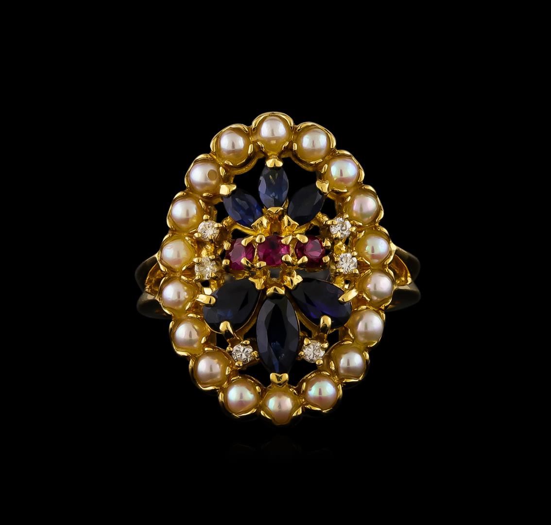 One electronically tested 18KT yellow gold ladies cast sapphire, ruby, diamond & pearl ring with a bright polish finish. The ring features a center ruby trio set within a sapphire floret with diamond accents framed by a ribbon of seed pearls supported by split shoulders, completed by a two millimeter wide band. Identified with markings of "18K". Condition is good. Containing: Six prong set marquise and pear mixed cut natural blue sapphires approximate total weight of 0.95ct., clarity is eye clean, type II, dark, very slightly grayish, blue color, (GIA B 7/3), cut is good. Transmitting light with no distortion, transparent. Color grade is an average for the group. Graded in the setting. Three prong set round mixed cut natural rubies approximate total weight of 0.18ct., clarity is eye clean, type II, medium dark, moderately strong, slightly purplish red color, (GIA slpR 6/4), cut is good. Transmitting light with no distortion, transparent. Color grade is an average for the group. Graded in the setting. Eighteen seed pearls, 2.5mm in size to 2.5mm in size. The pearls are white in color with a very good luster, near round, mostly clean Graded in the setting. A seed pearl is a small natural pearl, formed in either a saltwater oyster or fresh water mussel, that is usually less the a one-quarter grain in weight and smaller then 2mm in size and off-round in shape. In jewelry they are used as decorative borders, tiny accents in small patterns or in larger clusters woven together to make up an entire piece of jewelry. One of the most historically famous examples of seed pearl jewelry is that of a seed pearl suite (a necklace and two matching bracelets) purchased on April 28, 1862 from Tiffany and Co. for Mary Todd Lincoln from President Abraham Lincoln to wear to the first Lincoln inaugural ball. Six prong set round brilliant cut diamonds, measuring 1.50 - 1.50 x 0.90mm (depth est.) approximate total weight of 6 Stones = 0.08ct. Graded in the setting. Clarity I-1 to I-2. Color: G - I. Total Weight of Colored Stones 1.13ct.. Total Weight of Diamonds 0.08ct.. Total Weight of Ring 7.25gm. AIG Appraised.