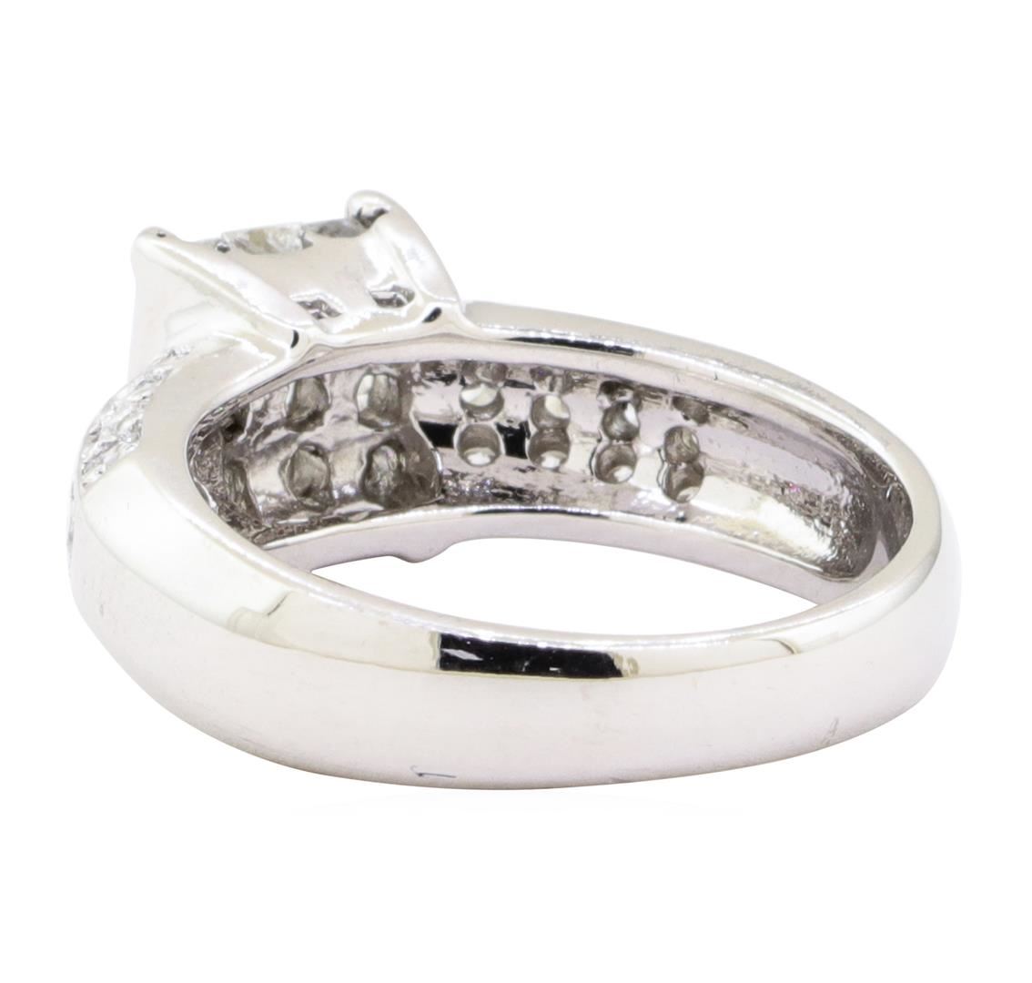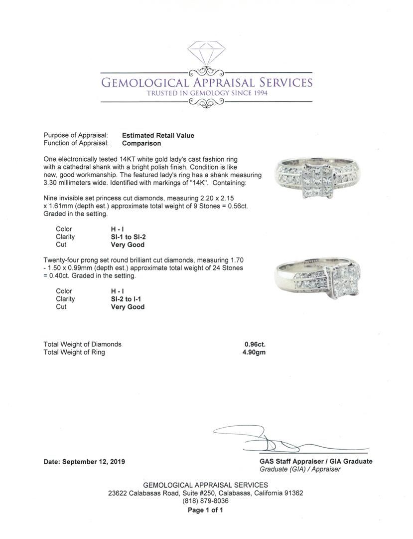 One electronically tested 14KT white gold lady's cast fashion ring with a cathedral shank with a bright polish finish. The featured lady's ring has a shank measuring 3.30 millimeters wide. Identified with markings of '14K'. Condition is Good. Containing: Nine invisible set princess cut diamonds, measuring 2.20 x 2.15 x 1.61mm (depth est.) approximate total weight of 9 Stones = 0.56ct. Graded in the setting. Color H - I Clarity SI-1 to SI-2 Cut Very Good Twenty-Four prong set round brilliant cut diamonds, measuring 1.70 - 1.50 x 0.99mm (depth est.) approximate total weight of 24 Stones = 0.40ct. Graded in the setting. Color H - I Clarity SI-2 to I-1 Cut Very Good. Total Weight of Diamonds 0.96ct.. Total Weight of Ring 4.90gm GAS Appraised at $2705.00. GAS Appraised.