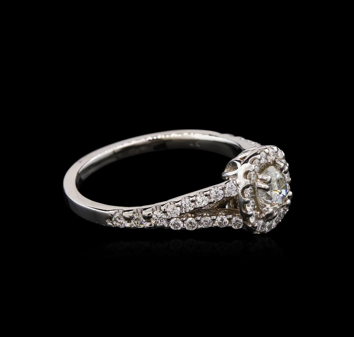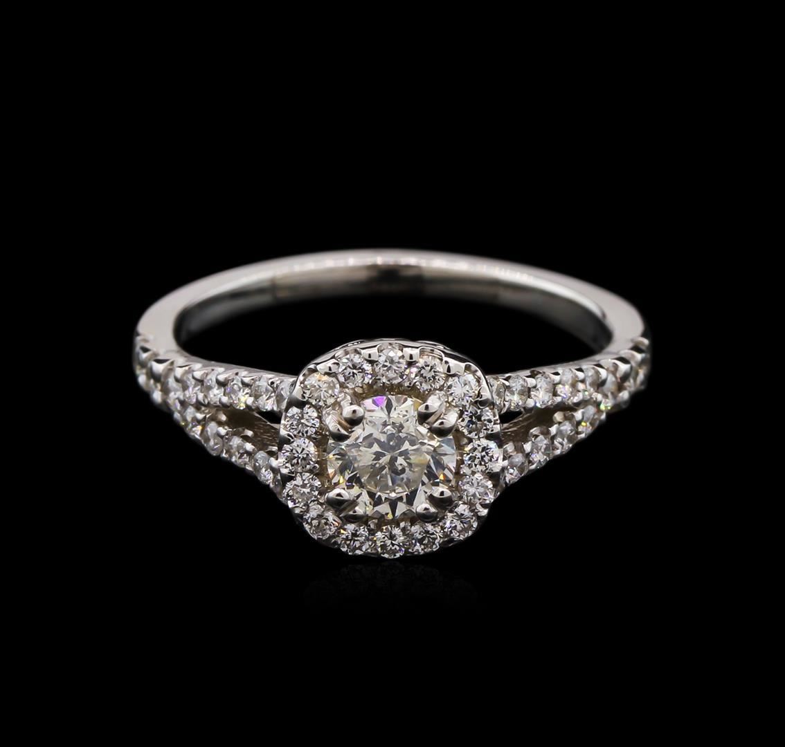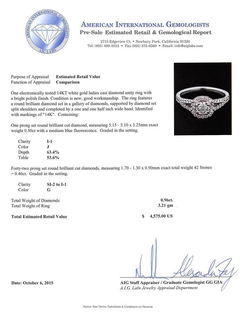 One electronically tested 14KT white gold ladies cast diamond unity ring with a bright polish finish. The ring features a round brilliant diamond set in a gallery of diamonds, supported by diamond set split shoulders and completed by a one and one half inch wide band. Identified with markings of "14K". Condition is new, good workmanship. Containing: One prong set round brilliant cut diamond, measuring 5.15 - 5.10 x 3.25mm exact weight 0.50ct with a medium blue fluorescence. Graded in the setting. Clarity: I-1. Color: J. Depth 63.4%. Table 53.6%. Forty-Two prong set round brilliant cut diamonds, measuring 1.70 - 1.30 x 0.90mm exact total weight 42 Stones = 0.46ct. Graded in the setting. Clarity: SI-2 to I-1. Color: G. Total Weight of Diamonds 0.96ct. Total Weight of Ring 3.21gm. AIG Appraised.