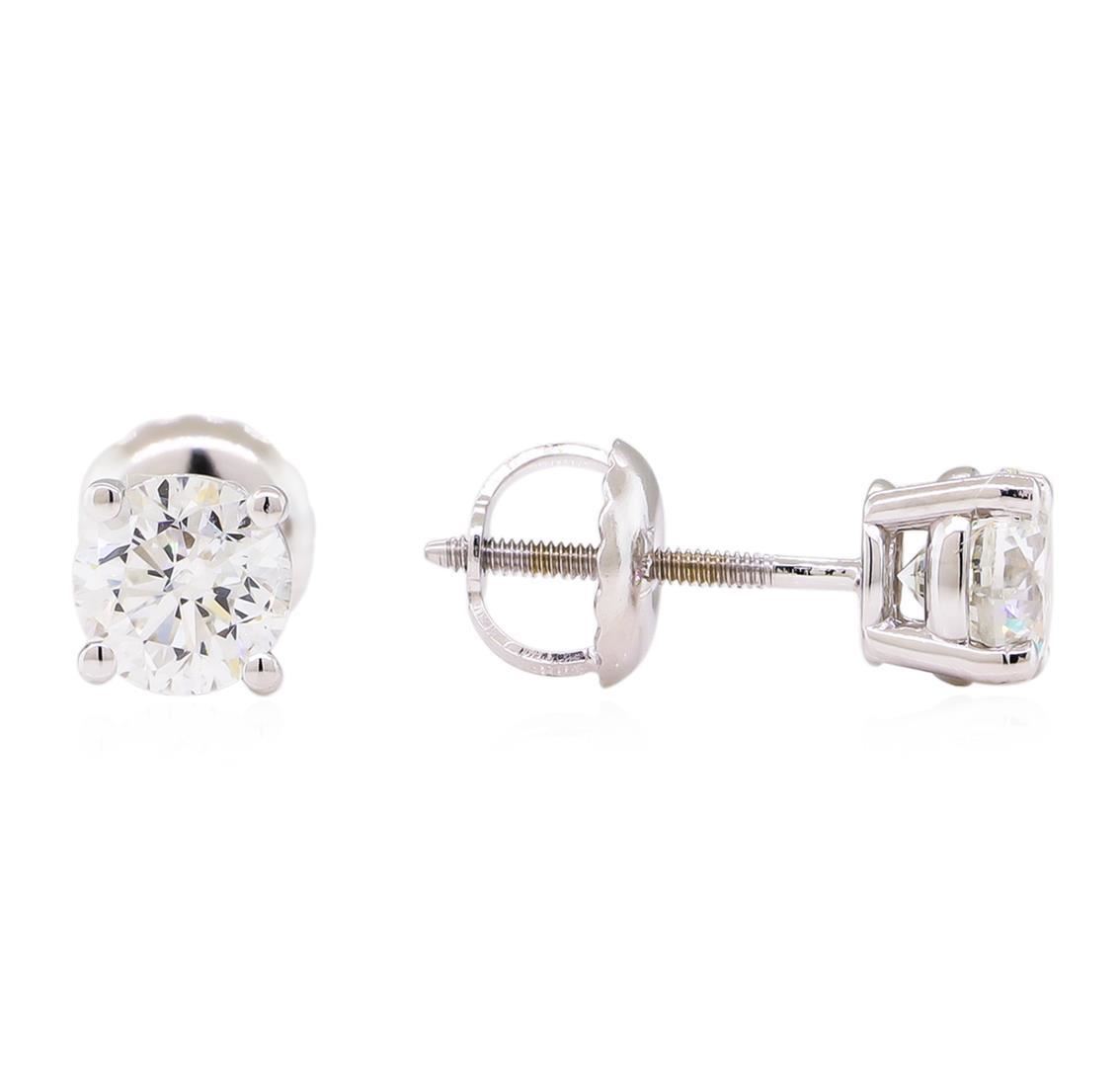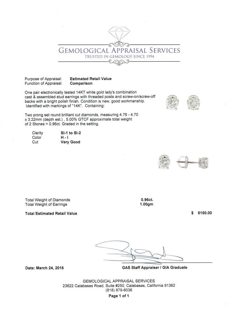 One pair electronically tested 14KT white gold lady's combination cast & assembled stud earrings with threaded posts and screw-on/screw-off backs with a bright polish finish. Identified with markings of "14K". Condition is new, good workmanship. Containing: Two prong set round brilliant cut diamonds, measuring 4.76 - 4.70 x 3.22mm (depth est.) , 5.00.%. GTCF approximate total weight of 2 Stones = 0.96ct. Graded in the setting. Clarity: SI-1 to SI-2. Color: H - I. Cut Very Good. Total Weight of Diamonds 0.96ct. Total Weight of Earrings 1.00gm. GAS Appraised.