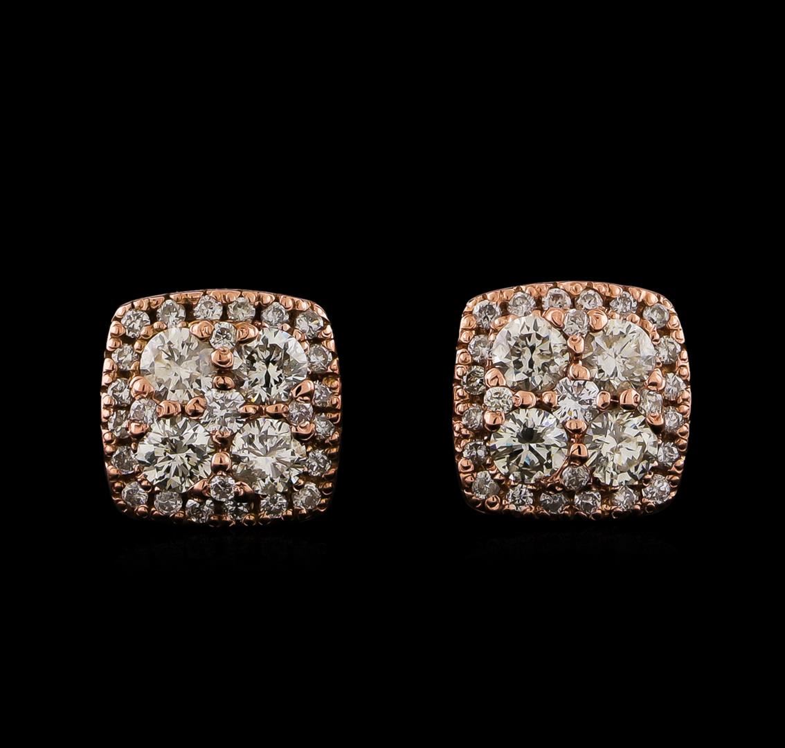 One pair electronically tested 14KT rose gold lady's combination cast & assembled stud earrings with friction posts with a bright polish finish. Identified with markings of "K14". Condition is new, good workmanship. Containing: Eight prong set round brilliant cut diamonds, measuring 2.90 - 2.80 x 1.74mm (depth est.) approximate total weight of 8 Stones = 0.69ct. Graded in the setting. Clarity: SI-1 to SI-2. Color: H - I. Cut Good Two prong set round brilliant cut diamonds, measuring 1.80 - 1.70 x 1.07mm (depth est.) approximate total weight of 2 Stones = 0.04ct. Graded in the setting. Clarity: SI-1. Color: Good Forty-Eight prong set round brilliant cut diamonds, measuring 1.15 - 1.05 x 0.68mm (depth est.) approximate total weight of 48 Stones = 0.24ct. Graded in the setting. Clarity: SI-1 to I-1. Color: H - I. Cut Good. Total Weight of Diamonds 0.97ct. Total Weight of Earrings 3.70gm. GAS Appraised.