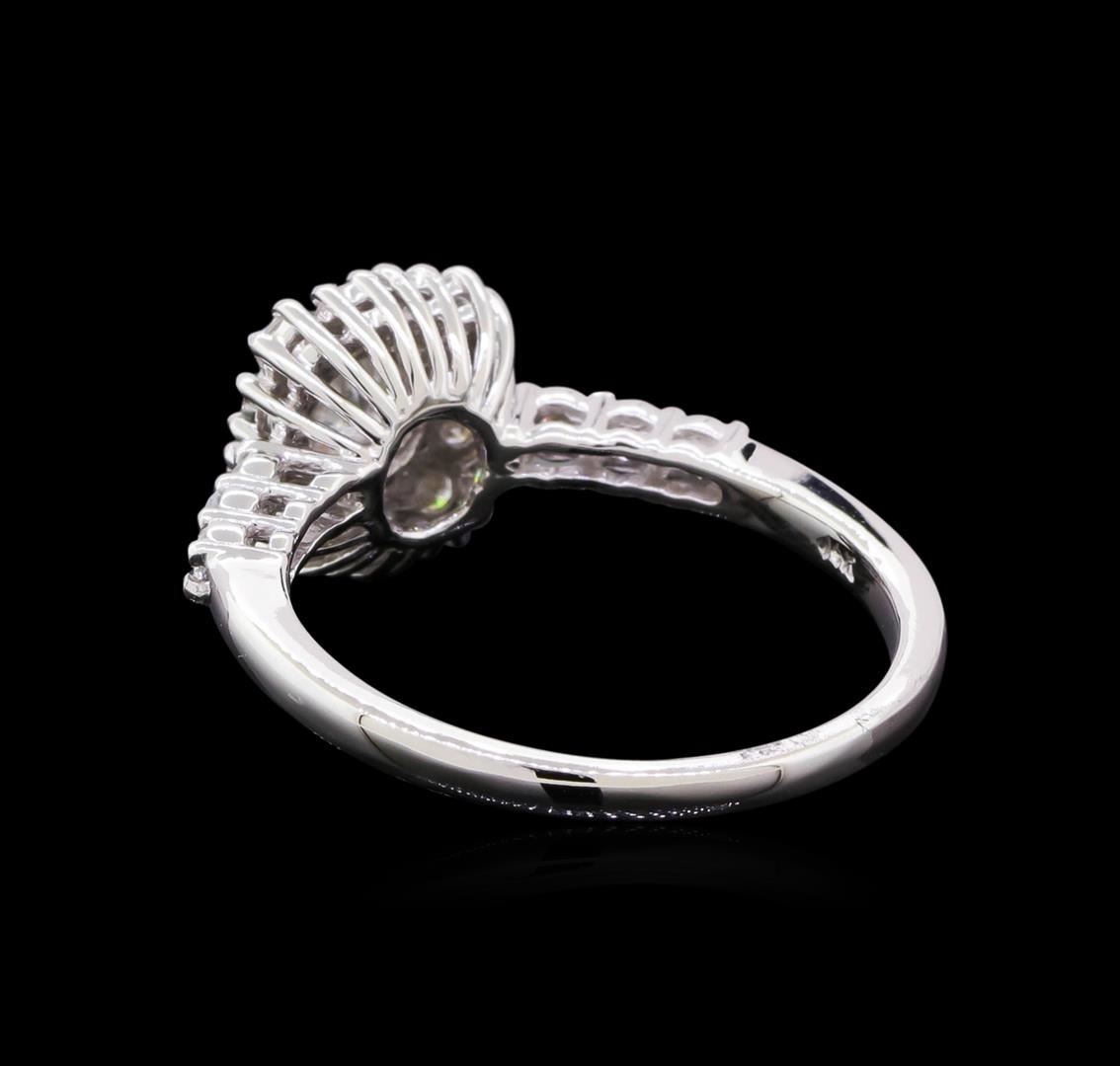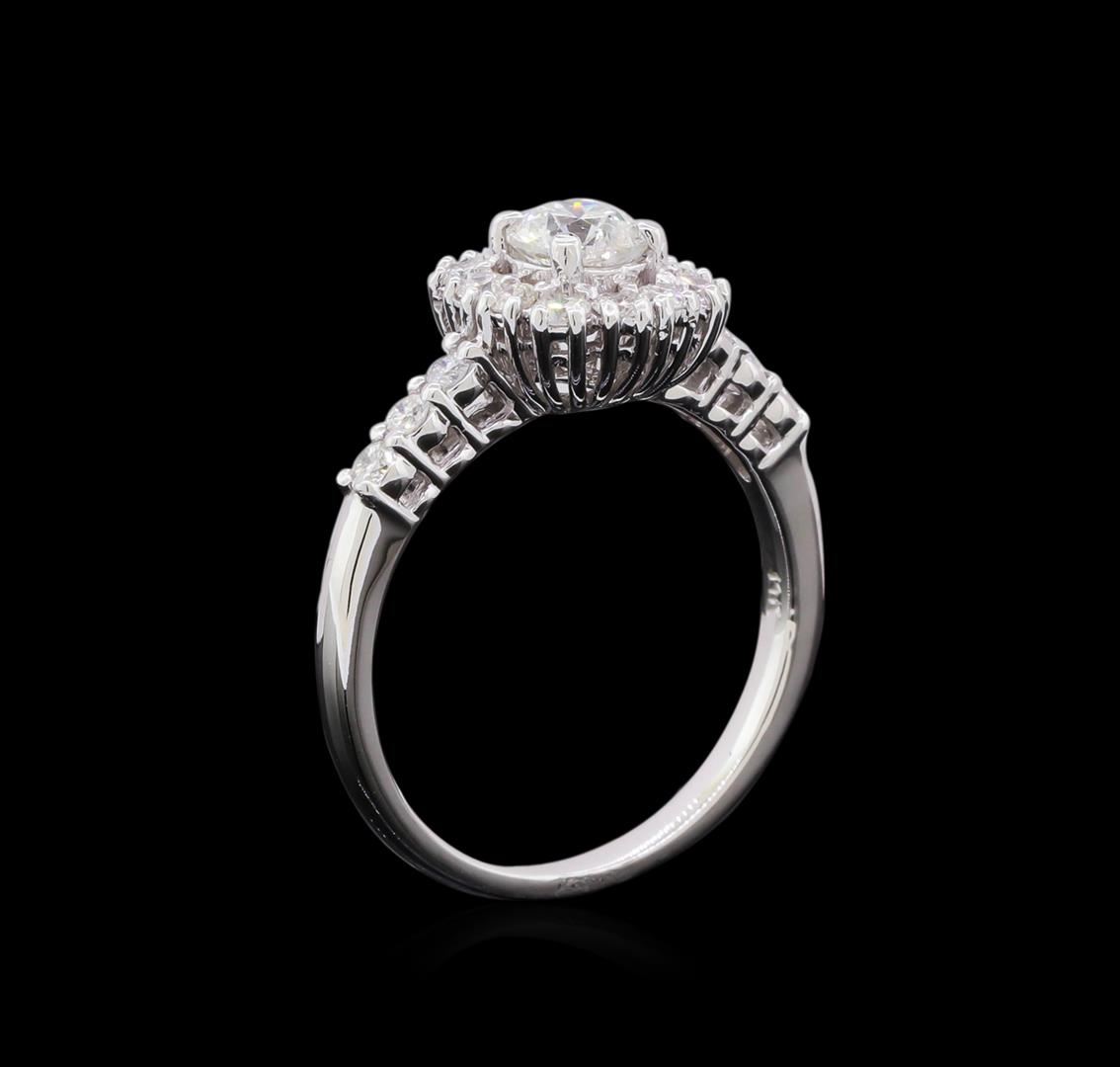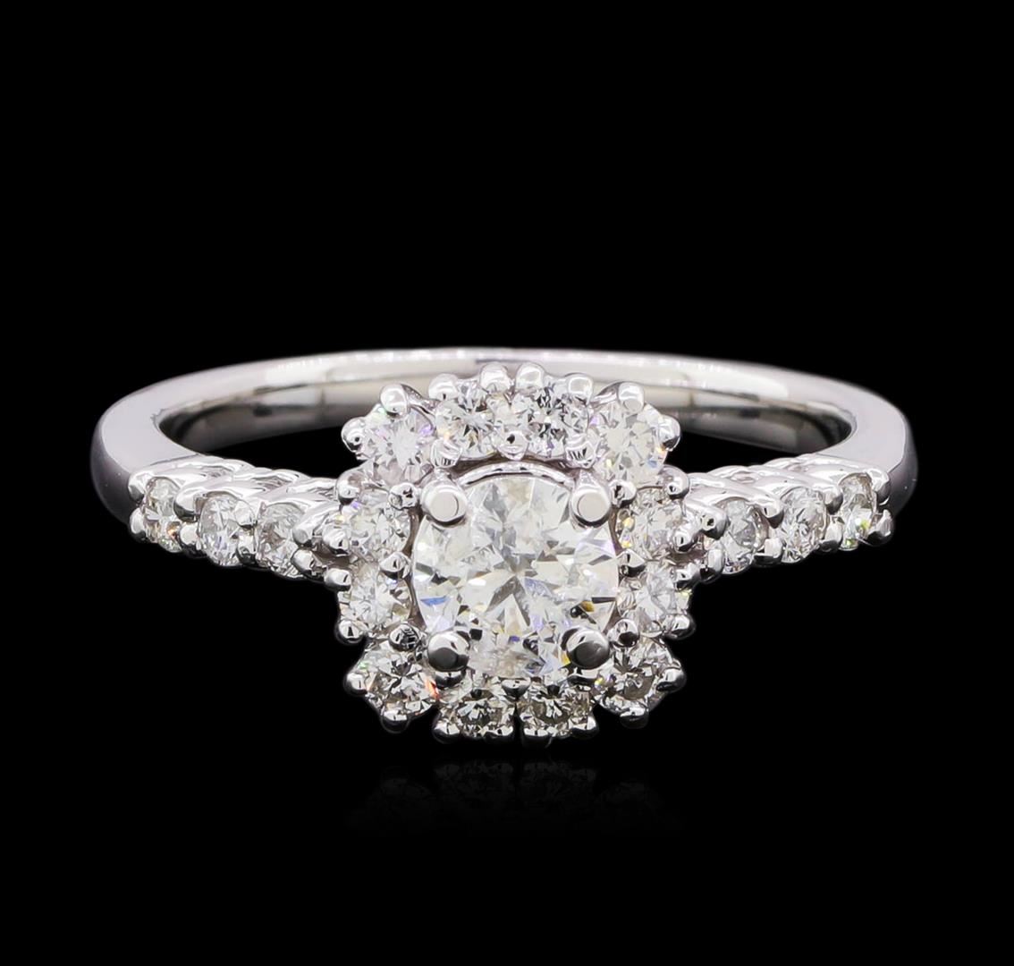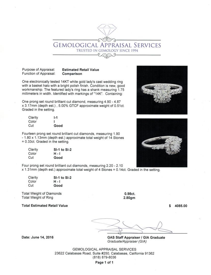 One electronically tested 14KT white gold lady's cast wedding ring with a basket halo with a bright polish finish. The featured lady's ring has a shank measuring 1.75 millimeters in width. Identified with markings of "14K". Condition is new, good workmanship. Containing: One prong set round brilliant cut diamond, measuring 4.90 - 4.87 x 3.17mm (depth est.) , 5.00.%. GTCF approximate weight of 0.51ct. Graded in the setting. Clarity: I-1. Color: I. Cut Good Fourteen prong set round brilliant cut diamonds, measuring 1.90 - 1.80 x 1.13mm (depth est.) approximate total weight of 14 Stones = 0.33ct. Graded in the setting. Clarity: SI-1 to SI-2. Color: H - I. Cut Good Four prong set round brilliant cut diamonds, measuring 2.20 - 2.10 x 1.31mm (depth est.) approximate total weight of 4 Stones = 0.14ct. Graded in the setting. Clarity: SI-1 to SI-2. Color: H - I. Cut Good. Total Weight of Diamonds 0.98ct. Total Weight of Ring 2.80gm. GAS Appraised at $4,085.00.