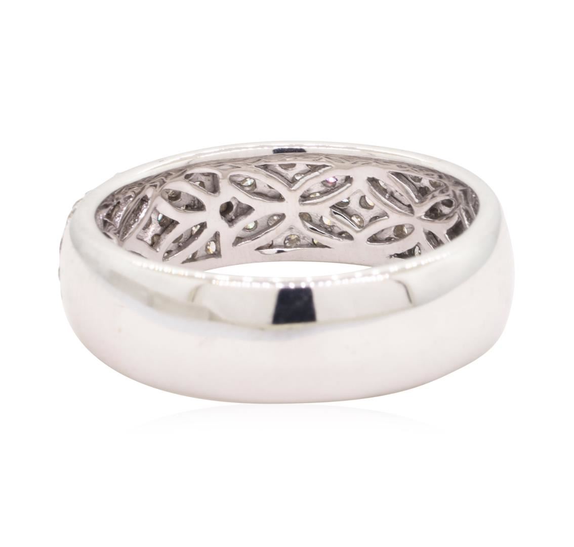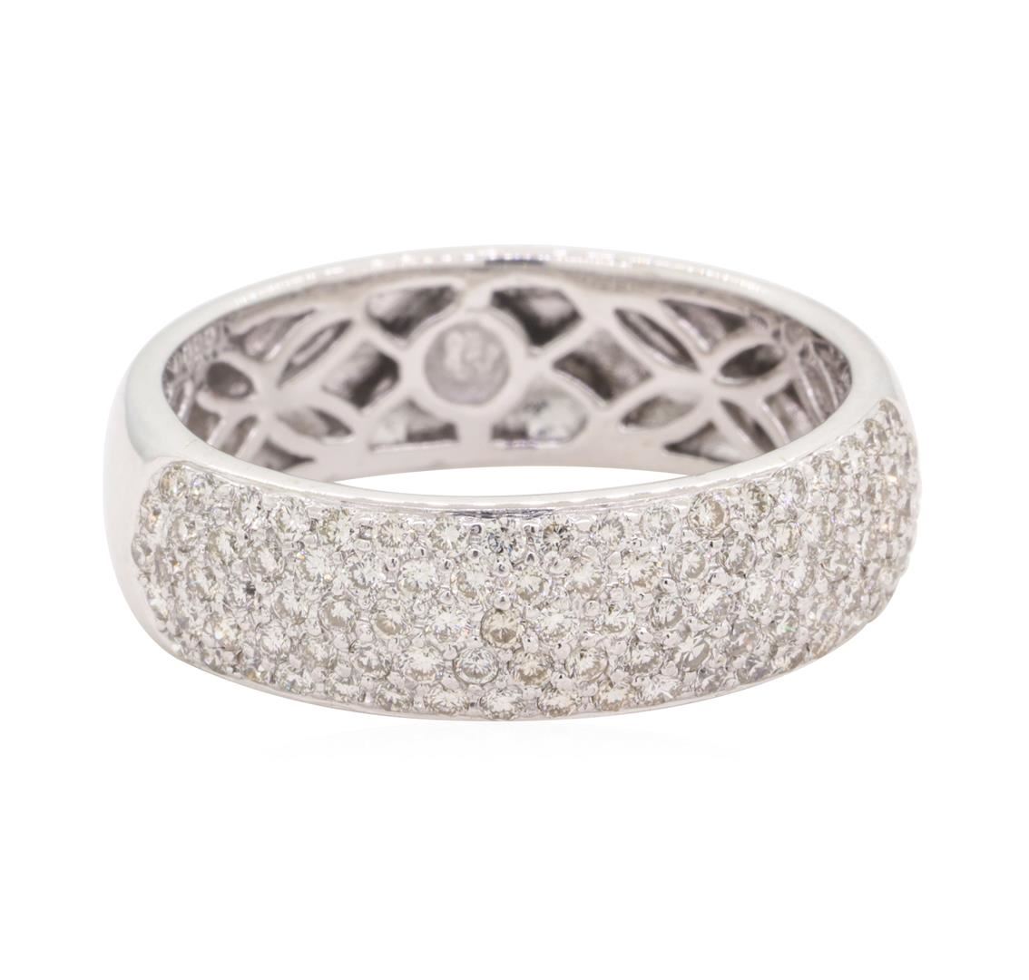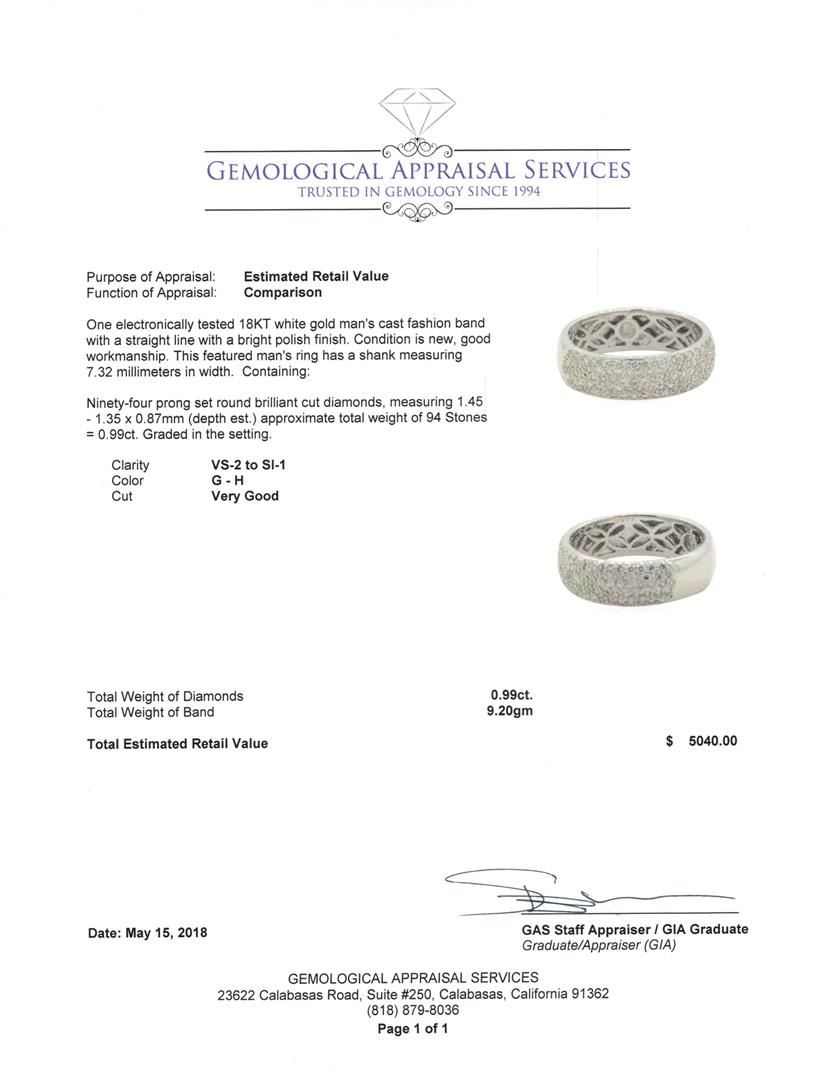One electronically tested 18KT white gold man's cast fashion band with a straight line with a bright polish finish. This featured man's ring has a shank measuring 7.32 millimeters in width. Condition is new, good workmanship. Containing: Ninety-Four prong set round brilliant cut diamonds, measuring 1.45 - 1.35 x 0.87mm (depth est.) approximate total weight of 94 Stones = 0.99ct. Graded in the setting. Color G - H Clarity VS-2 to SI-1 Cut Very Good. Total Weight of Diamonds 0.99ct.. Total Weight of Band 9.20gm GAS Appraised at $5040.00. GAS Appraised.