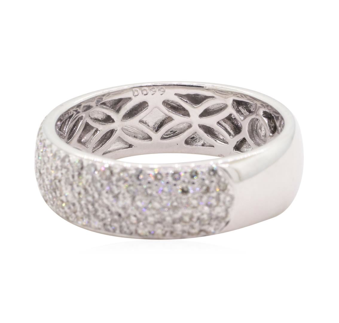 One electronically tested 18KT white gold man's cast fashion band with a straight line with a bright polish finish. This featured man's ring has a shank measuring 7.32 millimeters in width. Condition is new, good workmanship. Containing: Ninety-Four prong set round brilliant cut diamonds, measuring 1.45 - 1.35 x 0.87mm (depth est.) approximate total weight of 94 Stones = 0.99ct. Graded in the setting. Color G - H Clarity VS-2 to SI-1 Cut Very Good. Total Weight of Diamonds 0.99ct.. Total Weight of Band 9.20gm GAS Appraised at $5040.00. GAS Appraised.