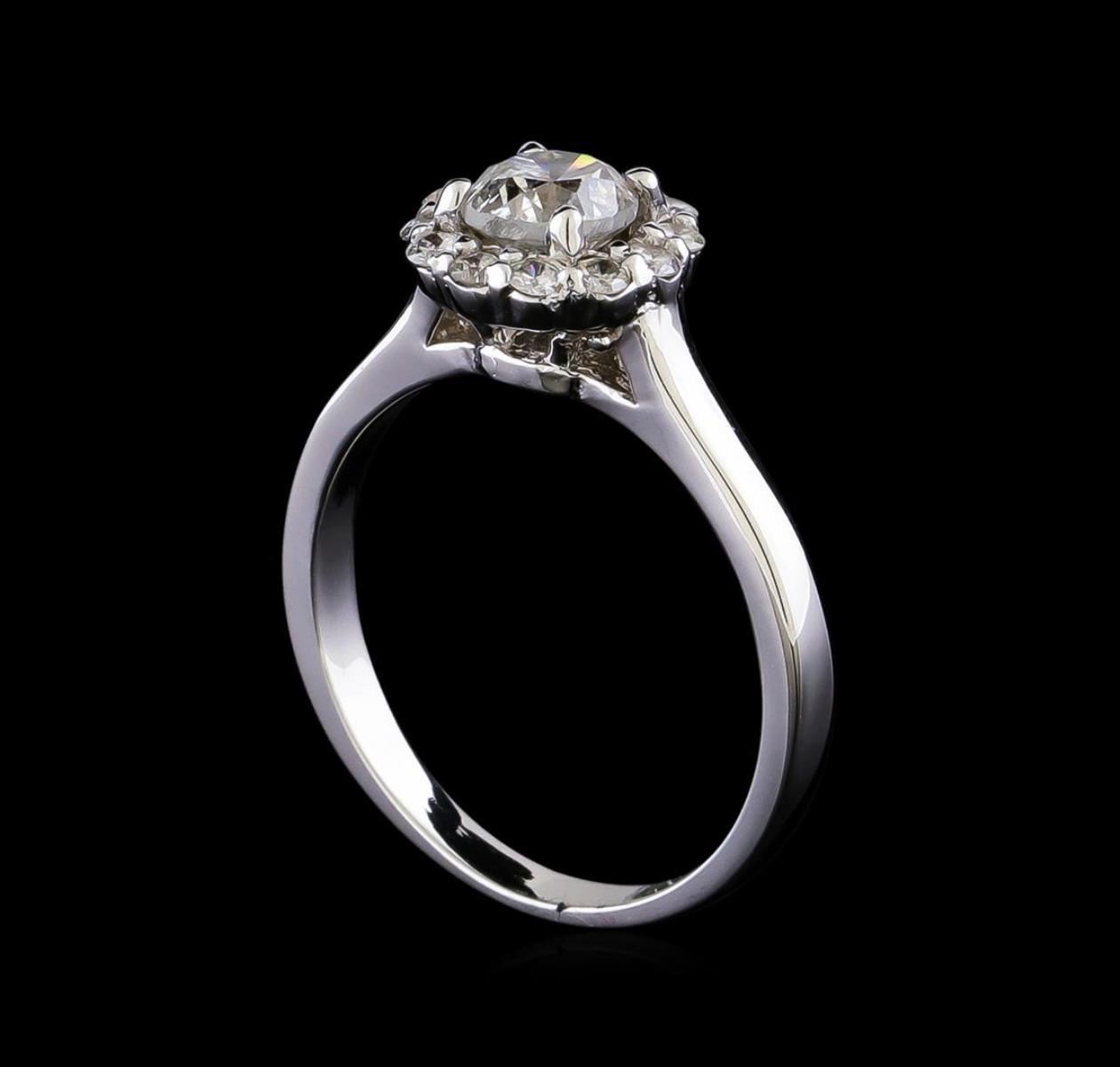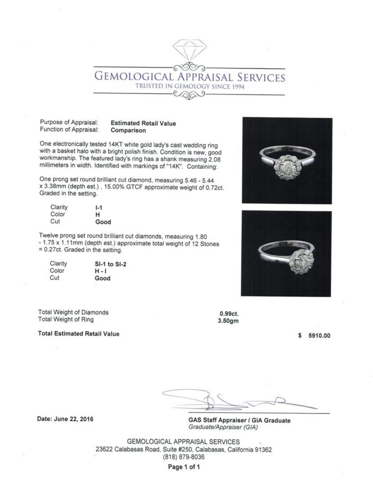One electronically tested 14KT white gold lady's cast wedding ring with a basket halo with a bright polish finish. The featured lady's ring has a shank measuring 2.08 millimeters in width. Identified with markings of "14K". Condition is new, good workmanship. Containing: One prong set round brilliant cut diamond, measuring 5.46 - 5.44 x 3.38mm (depth est.) , 15.00.%. GTCF approximate weight of 0.72ct. Graded in the setting. Clarity: I-1. Color: Good Twelve prong set round brilliant cut diamonds, measuring 1.80 - 1.75 x 1.11mm (depth est.) approximate total weight of 12 Stones = 0.27ct. Graded in the setting. Clarity: SI-1 to SI-2. Color: H - I. Cut Good. Total Weight of Diamonds 0.99ct. Total Weight of Ring 3.50gm. GAS Appraised at $5,910.00.