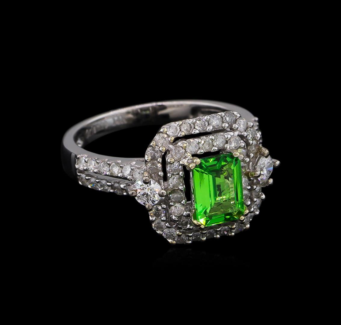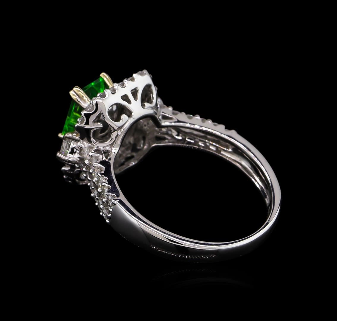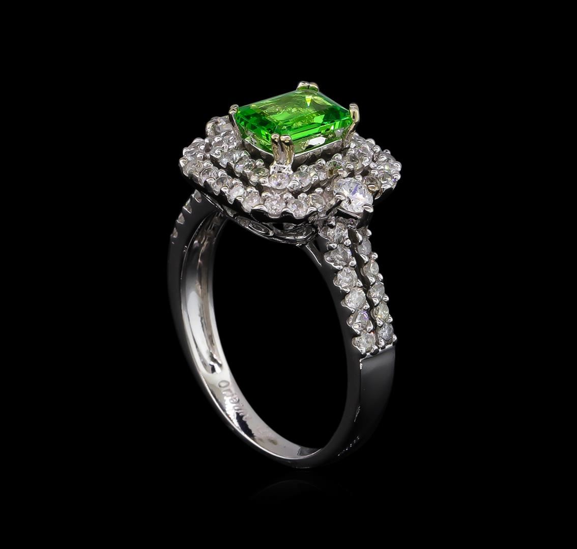 One electronically tested 14KT white gold lady's cast fashion ring with a cathedral shank with a double halo with a bright polish finish. The featured lady's ring has a shank measuring 2.51 millimeters wide. Trademark is Orianne. Identified with markings of "14K". Condition is new, good workmanship. Containing: One prong set emerald step cut natural tsavorite garnet, measuring 7.03 x 5.12 x 2.80mm, approximate weight of 0.99ct., clarity is eye clean, type II, medium, moderately strong, slightly yellowish green color, (GIA slyG 5/4), cut is very good. Transmitting light with no distortion, transparent. Colored gemstones are presumed to have been subjected to commonly used enhancement processes. Graded in the setting. Two prong set round brilliant cut diamonds, measuring 2.95 - 2.90 x 1.76mm (depth est.) approximate total weight of 2 Stones = 0.18ct. Graded in the setting. Clarity: SI-2. Color: H - I. Cut Good Sixty-Four prong set round brilliant cut diamonds, measuring 1.40 - 1.35 x 0.86mm (depth est.) approximate total weight of 64 Stones = 0.64ct. Graded in the setting. Clarity: I-1 to I-2. Color: H - I. Cut Good. Total Weight of Colored Stones 0.99ct. Total Weight of Diamonds 0.82ct. Total Weight of Ring 4.80gm. GAS Appraised at $5,390.00.