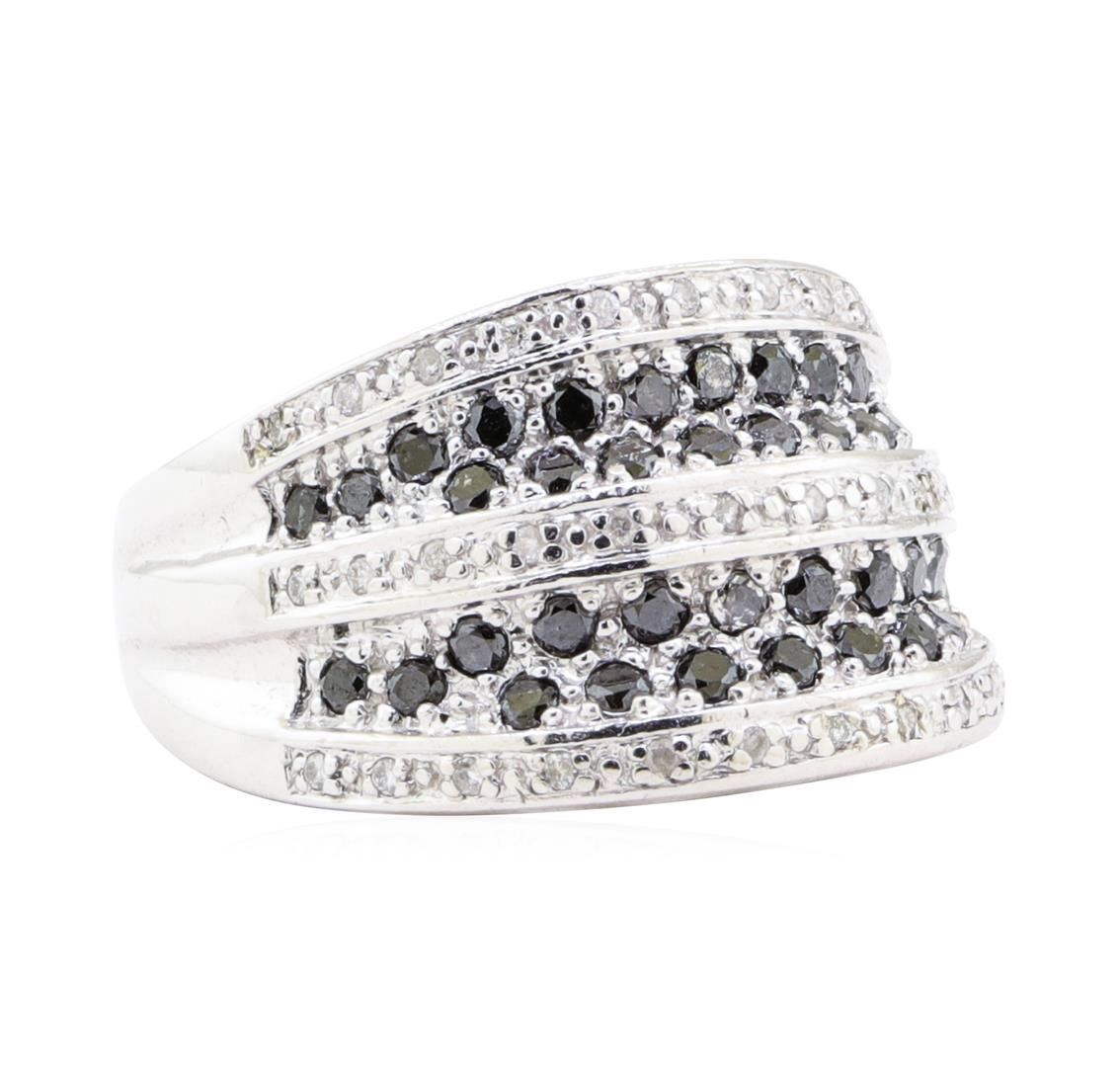 One electronically tested 14KT white gold lady's cast fashion ring with a tapered wide band with a bright polish finish. The featured lady's ring has a shank measuring 4.50 millimeters wide. Identified with markings of '14K 585'. Condition is Good. Containing: Forty prong set round brilliant cut diamonds, measuring 1.80 - 1.70 x 1.09mm (depth est.) approximate total weight of 40 Stones = 0.80ct. Colored gemstones are presumed to have been subjected to commonly used enhancement processes. Graded in the setting. Color Fancy Black Cut Good Thirty-Six prong set round brilliant cut diamonds, measuring 1.20 - 1.10 x 0.71mm (depth est.) approximate total weight of 36 Stones = 0.20ct. Graded in the setting. Color H - I Clarity I-1 to I-3 Cut Good. Total Weight of Diamonds 1.00ct.. Total Weight of Ring 10.80gm GAS Appraised at $2915.00. GAS Appraised.