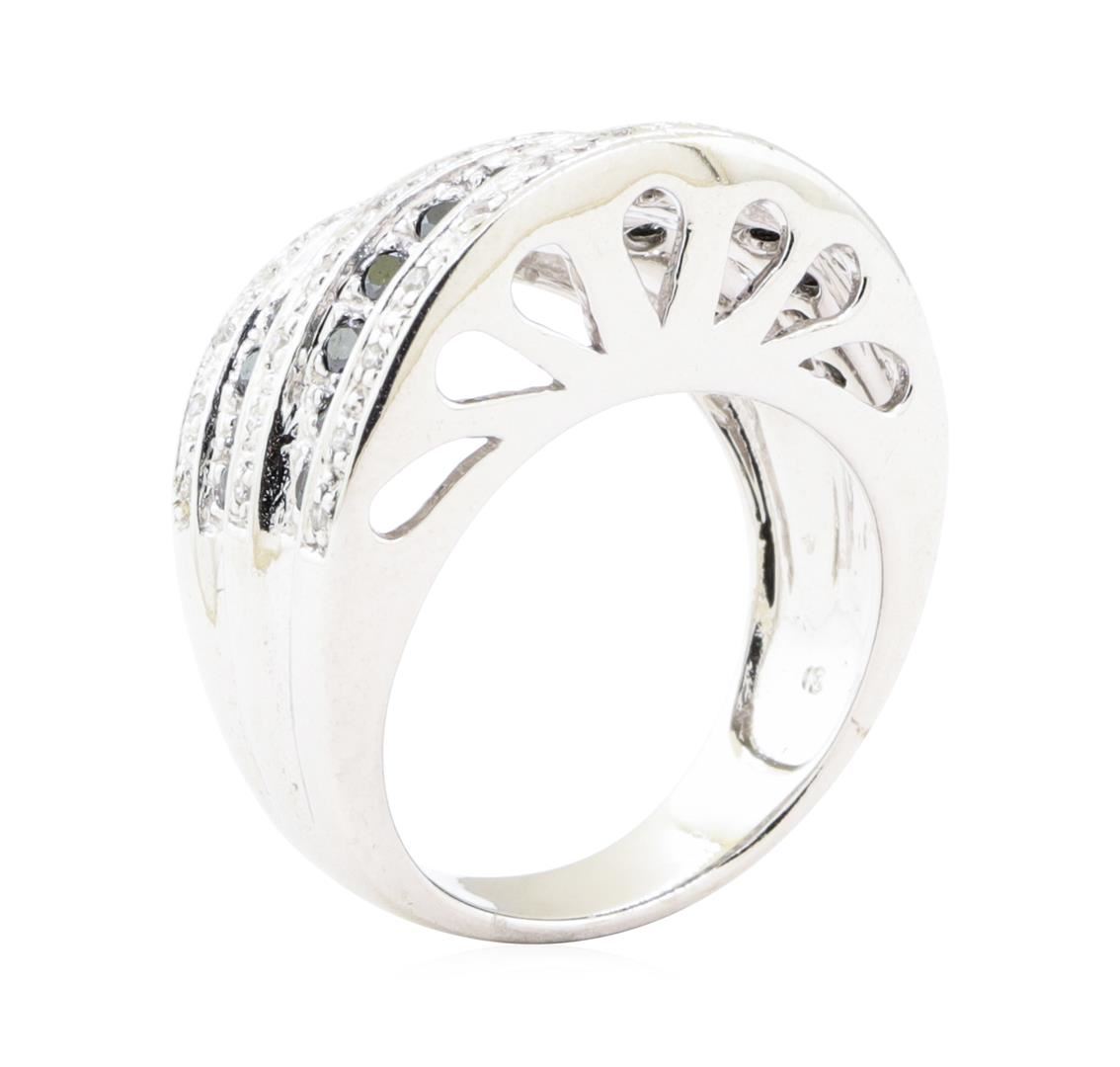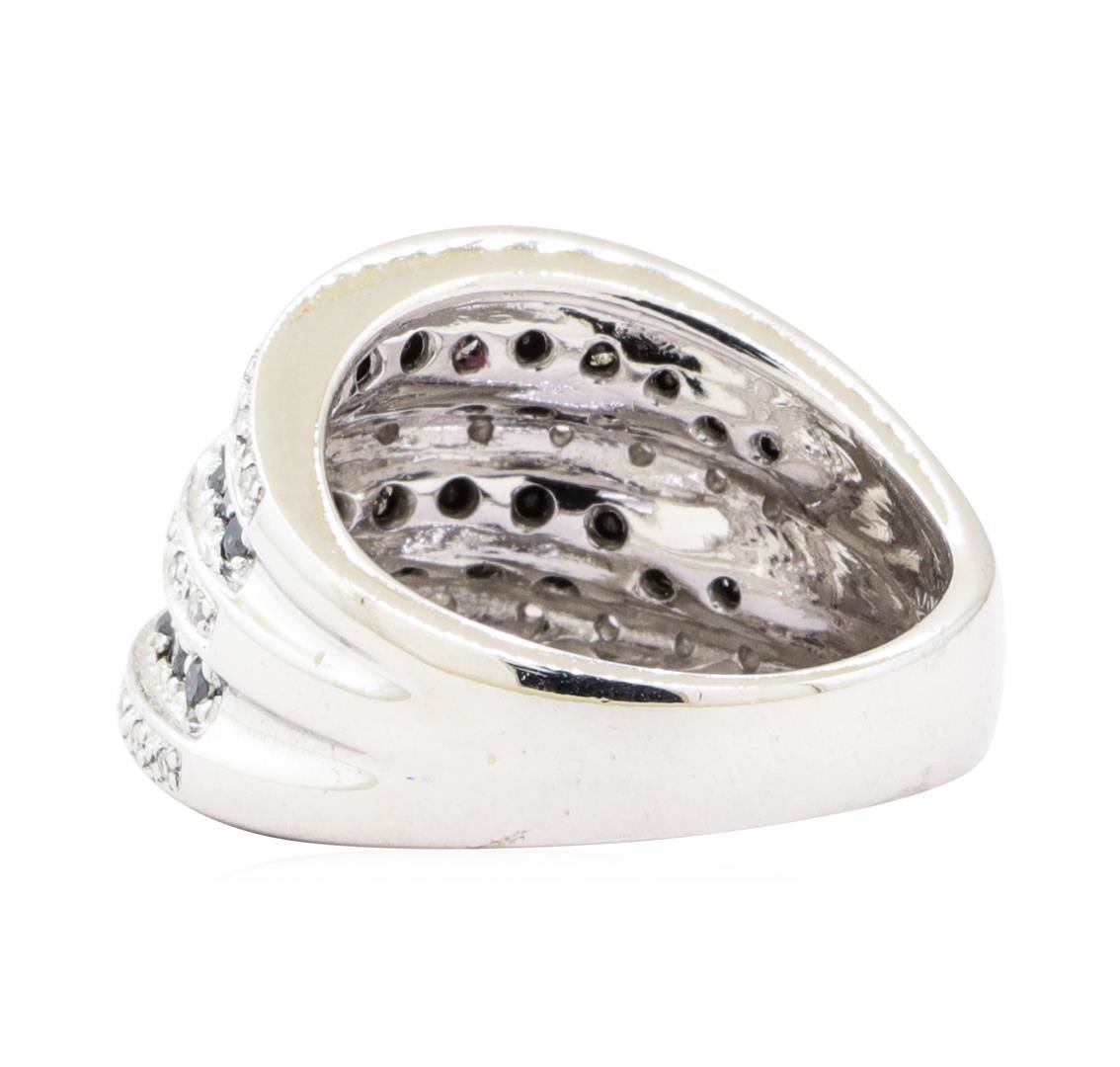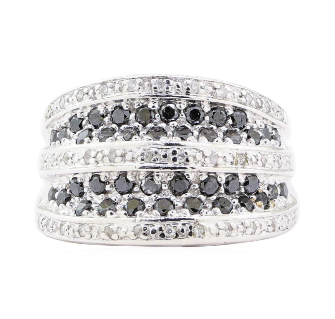 One electronically tested 14KT white gold lady's cast fashion ring with a tapered wide band with a bright polish finish. The featured lady's ring has a shank measuring 4.50 millimeters wide. Identified with markings of '14K 585'. Condition is Good. Containing: Forty prong set round brilliant cut diamonds, measuring 1.80 - 1.70 x 1.09mm (depth est.) approximate total weight of 40 Stones = 0.80ct. Colored gemstones are presumed to have been subjected to commonly used enhancement processes. Graded in the setting. Color Fancy Black Cut Good Thirty-Six prong set round brilliant cut diamonds, measuring 1.20 - 1.10 x 0.71mm (depth est.) approximate total weight of 36 Stones = 0.20ct. Graded in the setting. Color H - I Clarity I-1 to I-3 Cut Good. Total Weight of Diamonds 1.00ct.. Total Weight of Ring 10.80gm GAS Appraised at $2915.00. GAS Appraised.