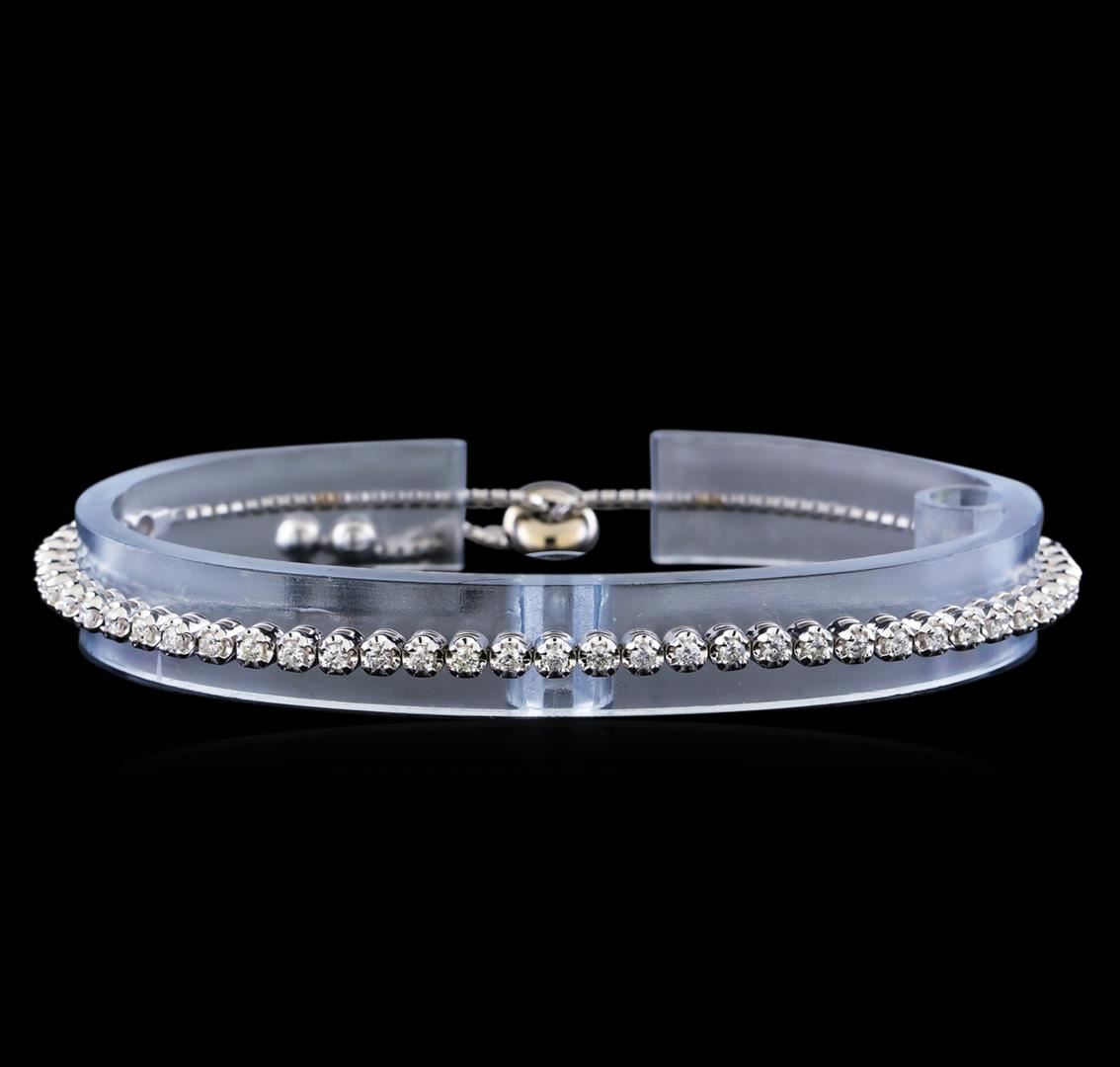 One electronically tested 14KT white gold lady's combination cast & assembled fashion adjustable bracelet with a slide clasp with a bright polish finish. The featured lady's adjustable bracelet measures from 9 inches to 6 inches in length. Identified with markings of "K14". Condition is new, good workmanship. Containing: Forty-One prong set round brilliant cut diamonds, measuring 1.90 - 1.80 x 1.13mm (depth est.) approximate total weight of 41 Stones = 1.00ct. Graded in the setting. Clarity: SI-1 to SI-2. Color: H - I. Cut Good. Total Weight of Diamonds 1.00ct. Total Weight of Adjustable Bracelet 9.00gm GAS Appraised at $3,845.00.
