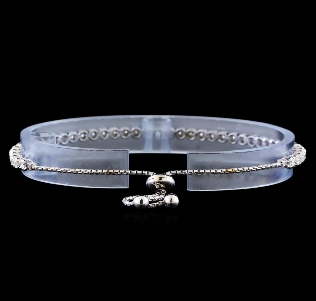 One electronically tested 14KT white gold lady's combination cast & assembled fashion adjustable bracelet with a slide clasp with a bright polish finish. The featured lady's adjustable bracelet measures from 9 inches to 6 inches in length. Identified with markings of "K14". Condition is new, good workmanship. Containing: Forty-One prong set round brilliant cut diamonds, measuring 1.90 - 1.80 x 1.13mm (depth est.) approximate total weight of 41 Stones = 1.00ct. Graded in the setting. Clarity: SI-1 to SI-2. Color: H - I. Cut Good. Total Weight of Diamonds 1.00ct. Total Weight of Adjustable Bracelet 9.00gm GAS Appraised.