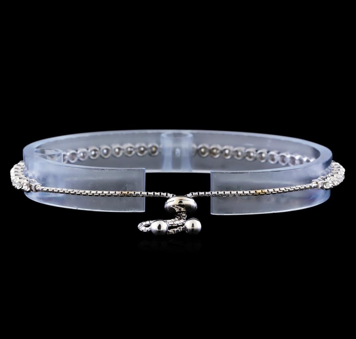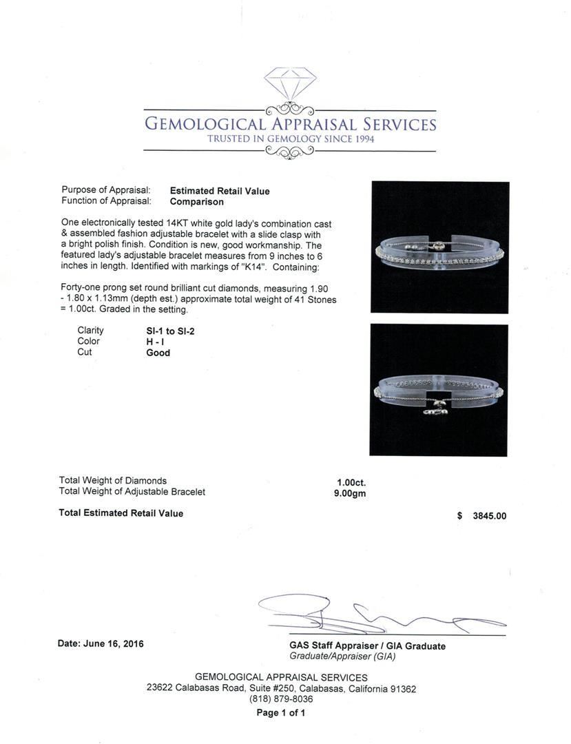 One electronically tested 14KT white gold lady's combination cast & assembled fashion adjustable bracelet with a slide clasp with a bright polish finish. The featured lady's adjustable bracelet measures from 9 inches to 6 inches in length. Identified with markings of "K14". Condition is new, good workmanship. Containing: Forty-One prong set round brilliant cut diamonds, measuring 1.90 - 1.80 x 1.13mm (depth est.) approximate total weight of 41 Stones = 1.00 ct. Graded in the setting. Clarity: SI-1 to SI-2. Color: H - I. Cut Good. Total Weight of Diamonds 1.00 ct. Total Weight of Adjustable Bracelet 9.00gm GAS Appraised.