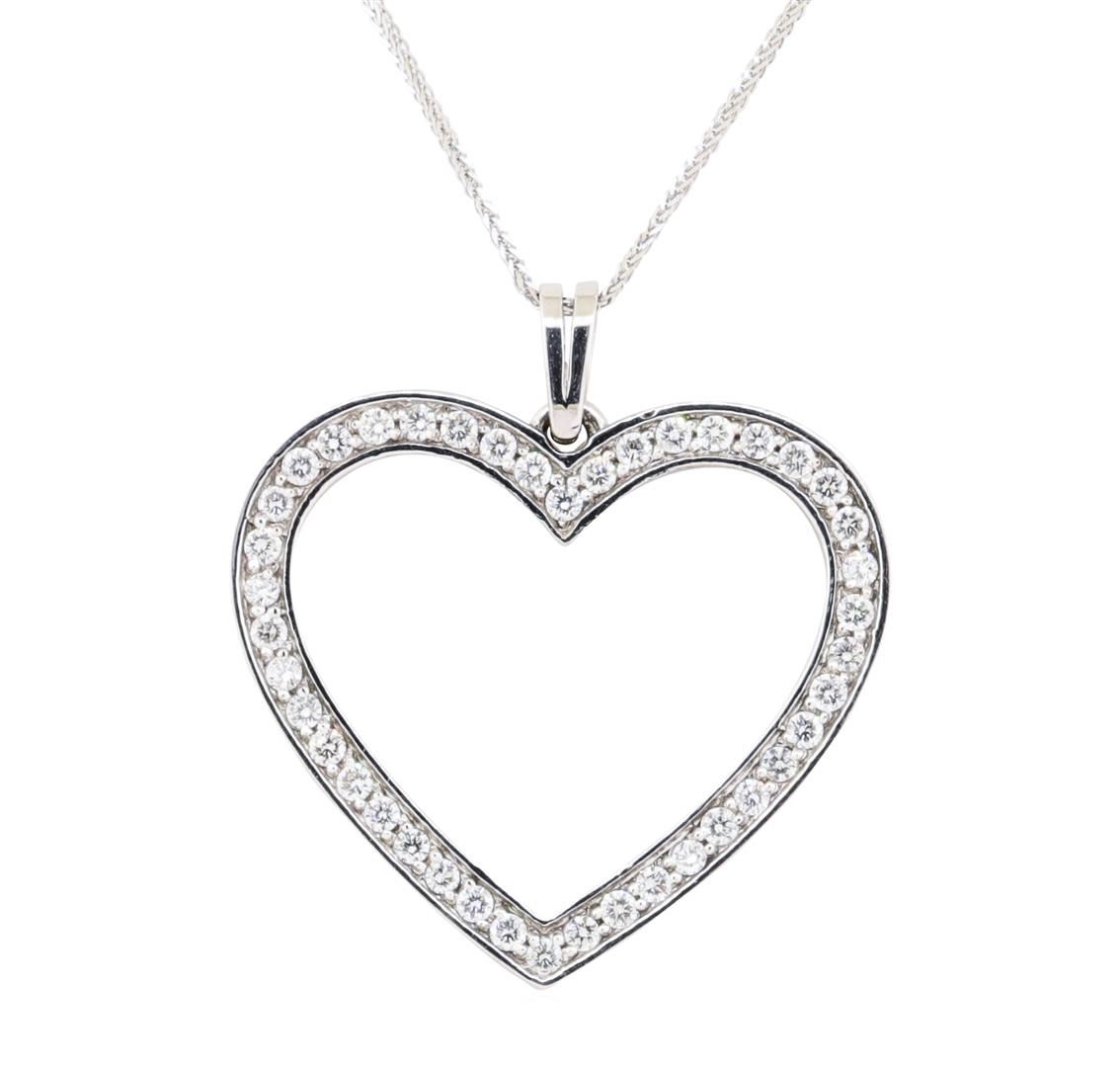 One pendant with chain featuring: 14KT white gold weighing 7.2 grams containing diamonds weighing 1.00. The chain is a 1mm square wheat chain measuring 20 inches long.