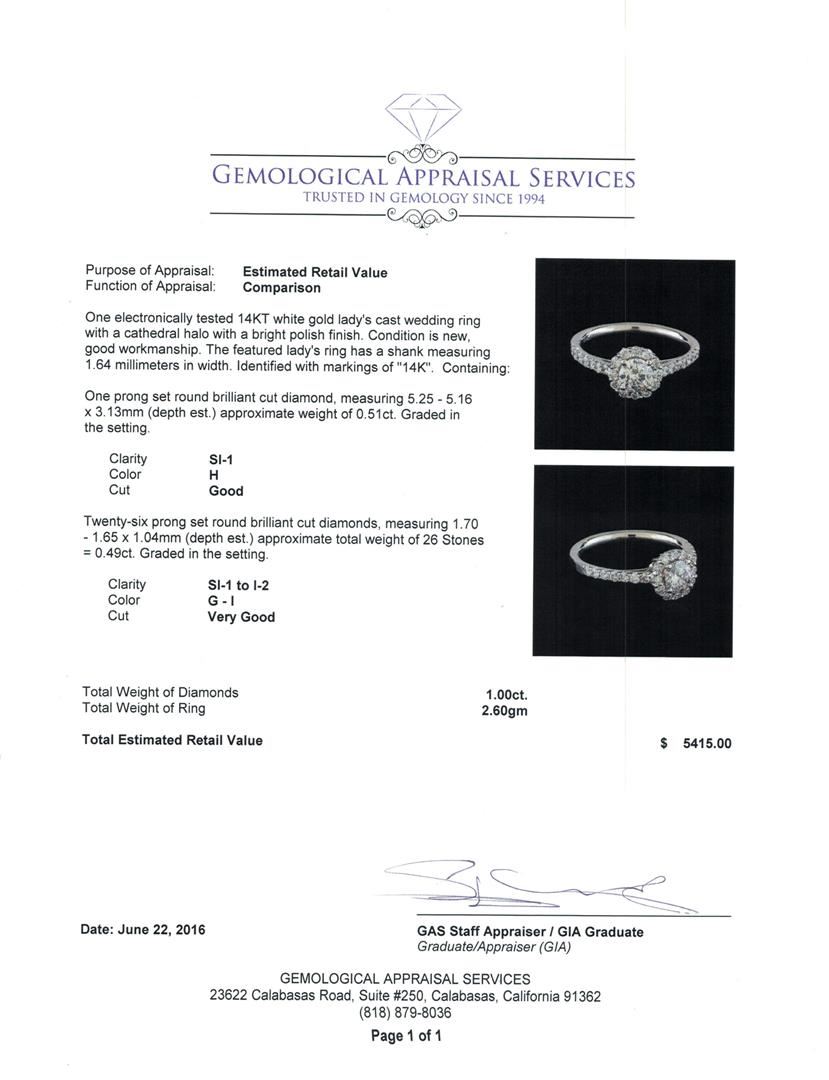 One electronically tested 14KT white gold lady's cast wedding ring with a cathedral halo with a bright polish finish. The featured lady's ring has a shank measuring 1.64 millimeters in width. Identified with markings of "14K". Condition is new, good workmanship. Containing: One prong set round brilliant cut diamond, measuring 5.25 - 5.16 x 3.13mm (depth est.) approximate weight of 0.51ct. Graded in the setting. Clarity: SI-1. Color: Good Twenty-Six prong set round brilliant cut diamonds, measuring 1.70 - 1.65 x 1.04mm (depth est.) approximate total weight of 26 Stones = 0.49ct. Graded in the setting. Clarity: SI-1 to I-2. Color: G - I. Cut Very Good. Total Weight of Diamonds 1.00ct. Total Weight of Ring 2.60gm. GAS Appraised at $5,415.00.