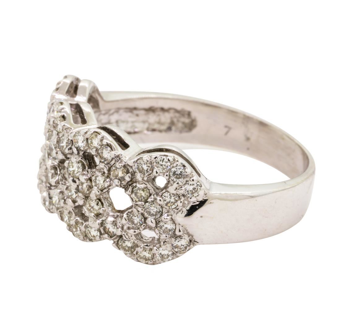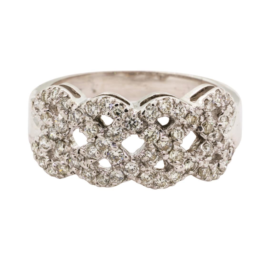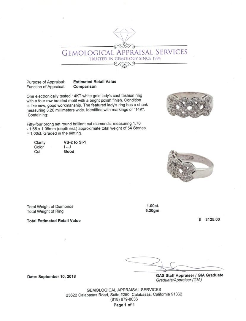 One electronically tested 14KT white gold lady's cast fashion ring with a four row braided motif with a bright polish finish. The featured lady's ring has a shank measuring 3.20 millimeters wide. Identified with markings of '14K'. Condition is like new, good workmanship. Containing: Fifty-Four prong set round brilliant cut diamonds, measuring 1.70 - 1.65 x 1.08mm (depth est.) approximate total weight of 54 Stones = 1.00ct. Graded in the setting. Color I - J Clarity VS-2 to SI-1 Cut Good. Total Weight of Diamonds 1.00ct.. Total Weight of Ring 5.30gm GAS Appraised at $3125.00. GAS Appraised.