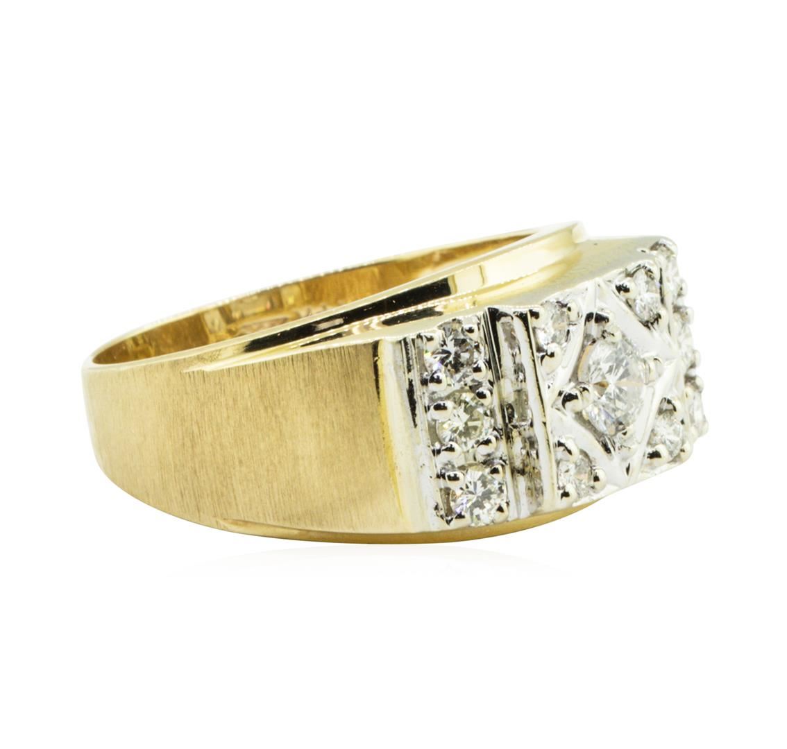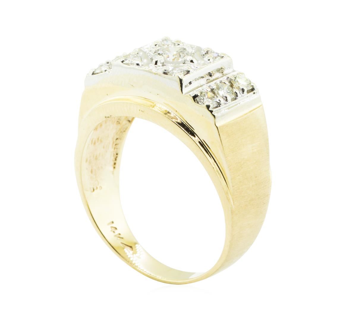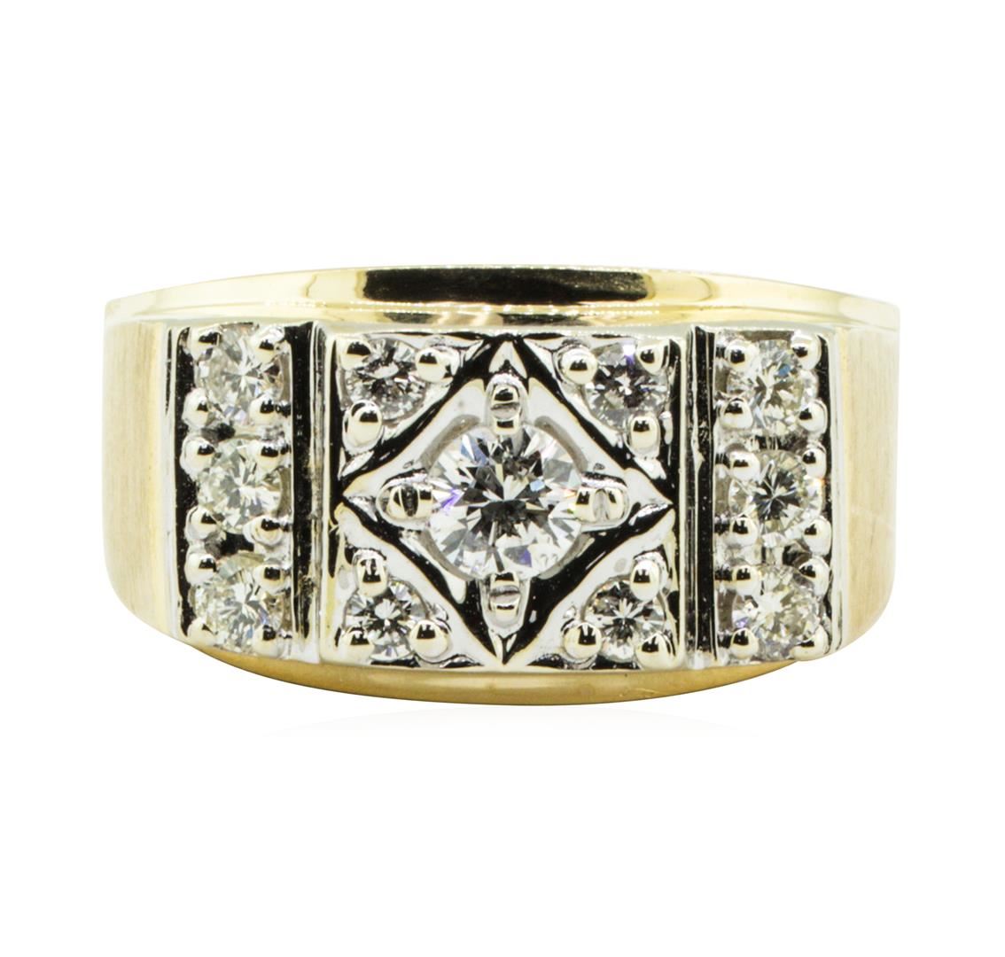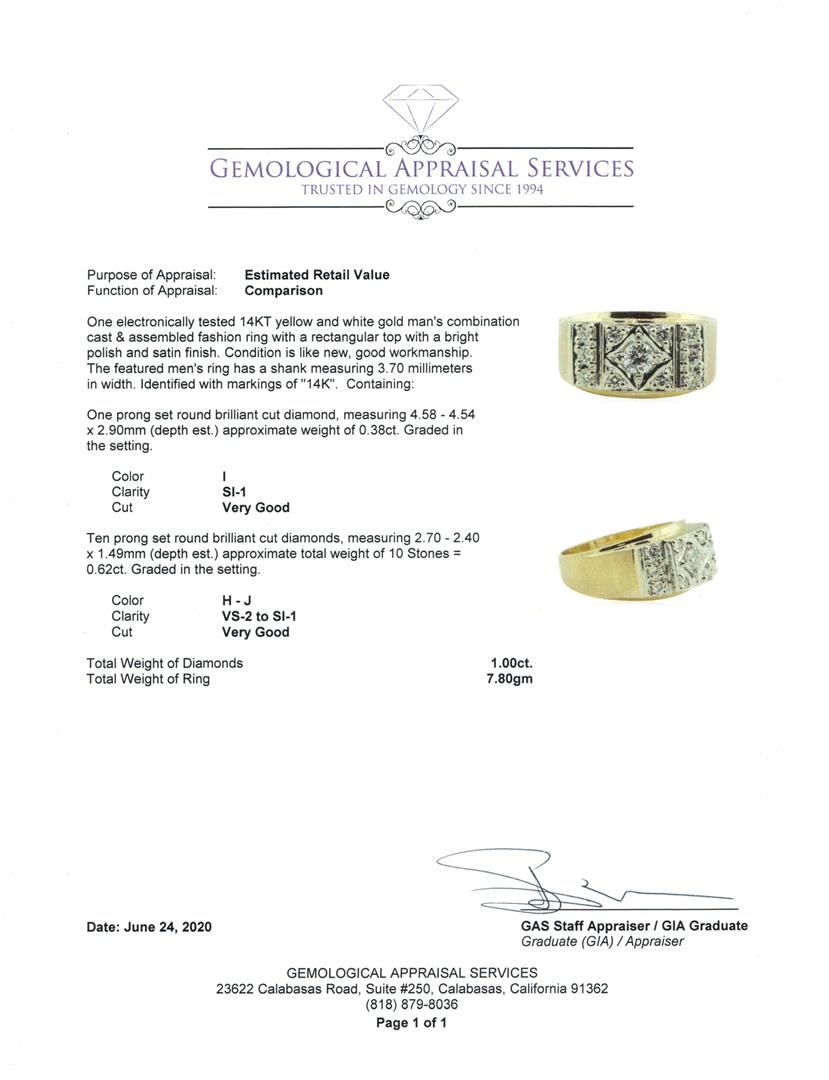 One electronically tested 14KT yellow and white gold man's combination cast & assembled fashion ring with a rectangular top with a bright polish and satin finish. The featured men's ring has a shank measuring 3.70 millimeters in width. Identified with markings of '14K'. Condition is like new, good workmanship. Containing: One prong set round brilliant cut diamond, measuring 4.58 - 4.54 x 2.90mm (depth est.) approximate weight of 0.38ct. Graded in the setting. Color I Clarity SI-1 Cut Very Good Ten prong set round brilliant cut diamonds, measuring 2.70 - 2.40 x 1.49mm (depth est.) approximate total weight of 10 Stones = 0.62ct. Graded in the setting. Color H - J Clarity VS-2 to SI-1 Cut Very Good. Total Weight of Diamonds 1.00ct.. Total Weight of Ring 7.80gm GAS Appraised at $4210.00. GAS Appraised.
