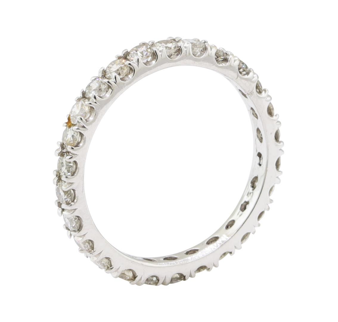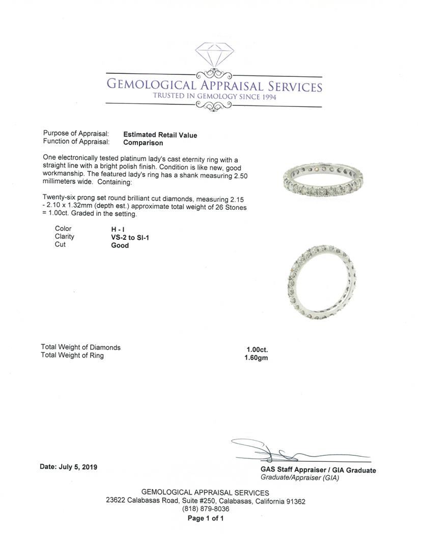One electronically tested platinum lady's cast eternity ring with a straight line with a bright polish finish. The featured lady's ring has a shank measuring 2.50 millimeters wide. Condition is like new, good workmanship. Containing: Twenty-Six prong set round brilliant cut diamonds, measuring 2.15 - 2.10 x 1.32mm (depth est.) approximate total weight of 26 Stones = 1.00ct. Graded in the setting. Color H - I Clarity VS-2 to SI-1 Cut Good. Total Weight of Diamonds 1.00ct.. Total Weight of Ring 1.60gm GAS Appraised at $2685.00. GAS Appraised.