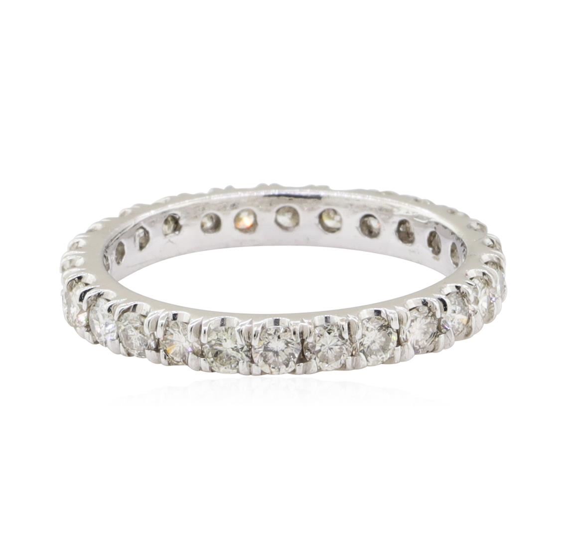 One electronically tested platinum lady's cast eternity ring with a straight line with a bright polish finish. The featured lady's ring has a shank measuring 2.50 millimeters wide. Condition is like new, good workmanship. Containing: Twenty-Six prong set round brilliant cut diamonds, measuring 2.15 - 2.10 x 1.32mm (depth est.) approximate total weight of 26 Stones = 1.00ct. Graded in the setting. Color H - I Clarity VS-2 to SI-1 Cut Good. Total Weight of Diamonds 1.00ct.. Total Weight of Ring 1.60gm GAS Appraised at $2685.00. GAS Appraised.