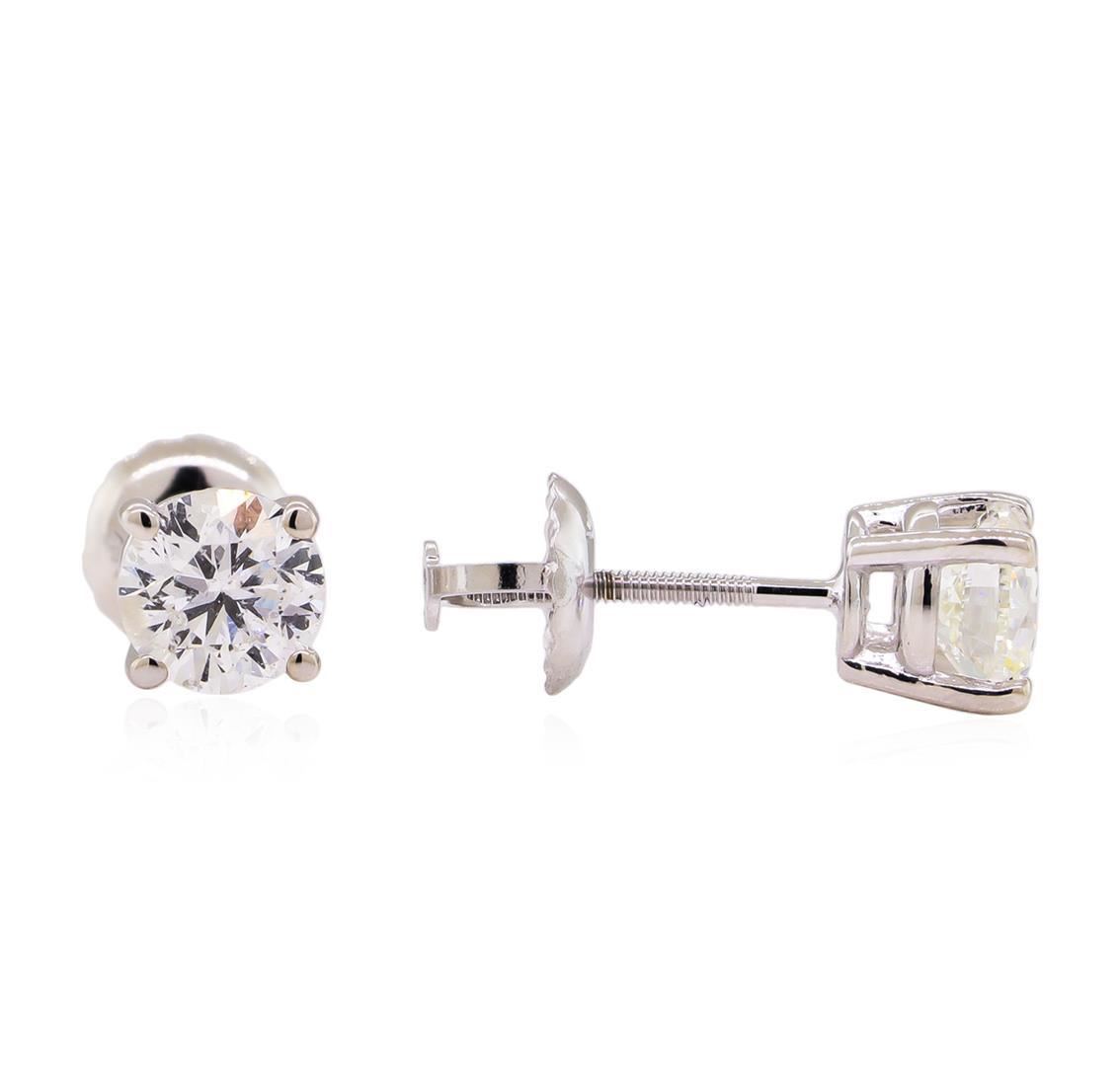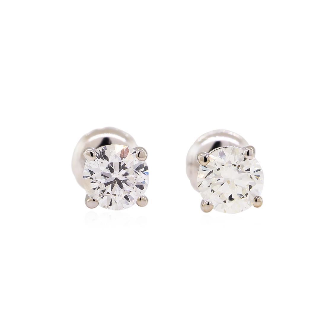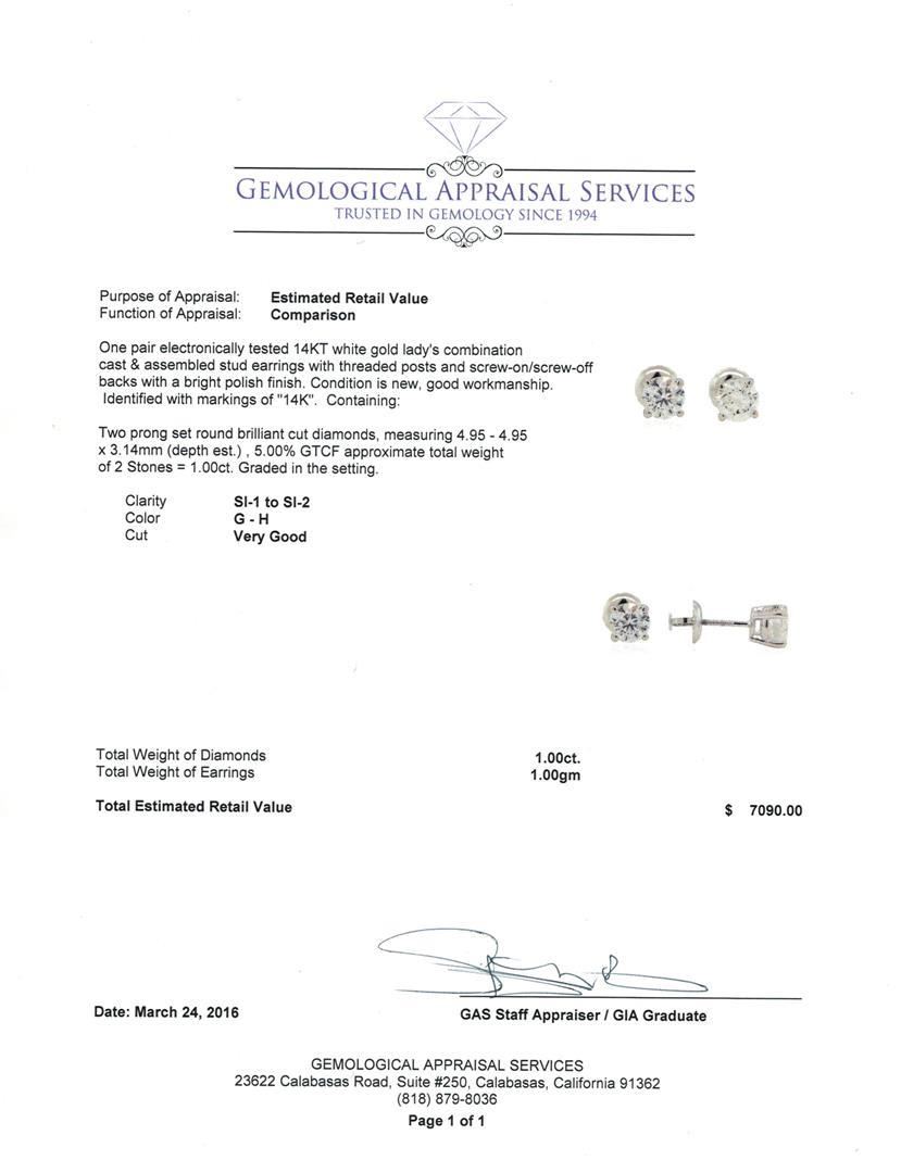 One pair electronically tested 14KT white gold lady's combination cast & assembled stud earrings with threaded posts and screw-on/screw-off backs with a bright polish finish. Identified with markings of "14K". Condition is new, good workmanship. Containing: Two prong set round brilliant cut diamonds, measuring 4.95 - 4.95 x 3.14mm (depth est.) , 5.00.%. GTCF approximate total weight of 2 Stones = 1.00ct. Graded in the setting. Clarity: SI-1 to SI-2. Color: G - Very Good. Total Weight of Diamonds 1.00ct. Total Weight of Earrings 1.00gm. GAS Appraised.
