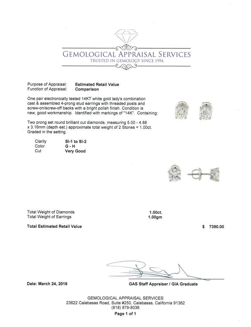 One pair electronically tested 14KT white gold lady's combination cast & assembled 4-prong stud earrings with threaded posts and screw-on/screw-off backs with a bright polish finish. Identified with markings of "14K". Condition is new, good workmanship. Containing: Two prong set round brilliant cut diamonds, measuring 5.00 - 4.88 x 3.16mm (depth est.) approximate total weight of 2 Stones = 1.00 ct. Graded in the setting. Clarity: SI-1 to SI-2. Color: G - Very Good. Total Weight of Diamonds 1.00 ct. Total Weight of Earrings 1.00gm. GAS Appraised.