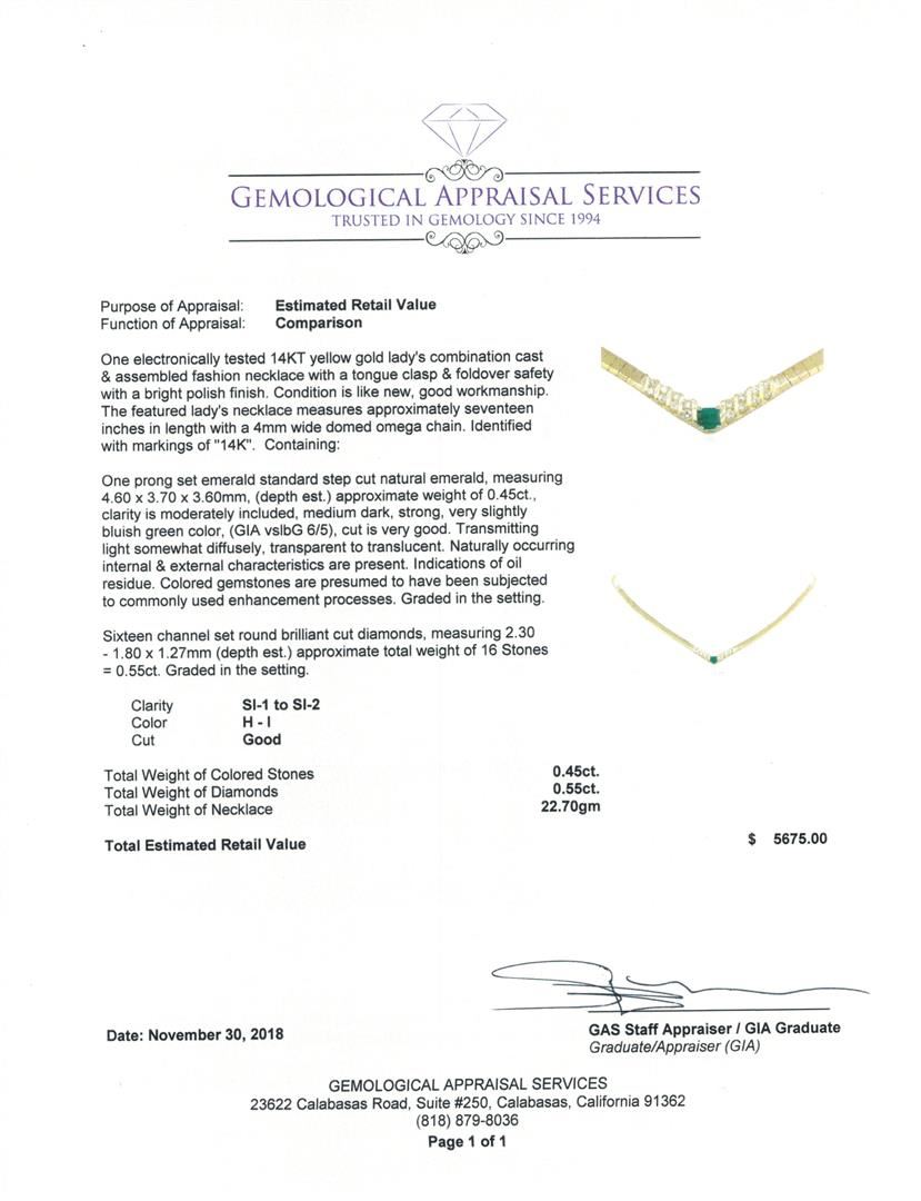 One electronically tested 14KT yellow gold lady's combination cast & assembled fashion necklace with a tongue clasp & foldover safety with a bright polish finish. The featured lady's necklace measures approximately seventeen inches in length with a 4mm wide domed omega chain. Identified with markings of '14K'. Condition is like new, good workmanship. Containing: One prong set emerald standard step cut natural emerald, measuring 4.60 x 3.70 x 3.60mm, (depth est.) approximate weight of 0.45ct., clarity is moderately included, medium dark, strong, very slightly bluish green color, (GIA vslbG 6/5), cut is very good. Transmitting light somewhat diffusely, transparent to translucent. Naturally occurring internal & external characteristics are present. Indications of oil residue. Colored gemstones are presumed to have been subjected to commonly used enhancement processes. Graded in the setting. Sixteen channel set round brilliant cut diamonds, measuring 2.30 - 1.80 x 1.27mm (depth est.) approximate total weight of 16 Stones = 0.55ct. Graded in the setting. Color H - I Clarity SI-1 to SI-2 Cut Good. Total Weight of Colored Stones 0.45ct.. Total Weight of Diamonds 0.55ct.. Total Weight of Necklace 22.70gm GAS Appraised at $5675.00. GAS Appraised.