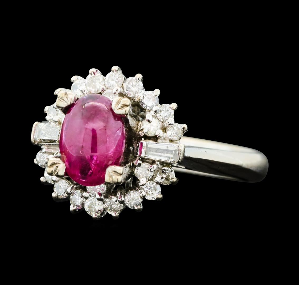 One electronically tested 10KT white gold lady's combination cast & assembled fashion ring with a basket halo with a bright polish finish. The featured lady's ring has a shank measuring 2.96 millimeters wide. Condition is used, good workmanship. Containing: One prong set oval cabochon cut natural ruby, measuring 7.10 x 5.08 x 2.90mm, (depth est.) approximate weight of 1.00ct., clarity is heavily included, medium, moderately strong, red color, (GIA R 5/4), cut is good. Transmitting light somewhat diffusely, semi-transparent to translucent. Naturally occurring internal & external characteristics are present. Indications of laboratory high temperature heat treatment. Colored gemstones are presumed to have been subjected to commonly used enhancement processes. Graded in the setting. Two prong set baguette cut (tapered) diamonds, measuring from 3.00 x 1.20 x 1.02mm (depth est.) to 3.10 x 1.30 x 1.11mm (depth est.) approximate total weight of 2 Stones = 0.08ct. Graded in the setting. Color H - I Clarity SI-1 to SI-2 Cut Good Twenty-Four prong set round brilliant cut diamonds, measuring 1.50 - 1.40 x 0.90mm (depth est.) approximate total weight of 24 Stones = 0.28ct. Graded in the setting. Color H - I Clarity SI-1 to I-1 Cut Good. Total Weight of Colored Stones 1.00ct.. Total Weight of Diamonds 0.36ct.. Total Weight of Ring 4.20gm. GAS Appraised.