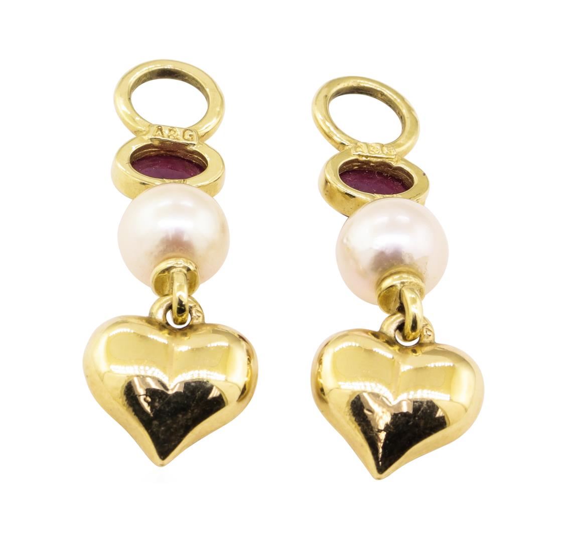 One pair of earring enhancers measuring 32 millimeters in length featuring: 14KT yellow gold weighing 4.5 grams containing two oval cabochon rubies weighing 1.00ctw and two pearls measuring 7.2 millimeters in diameter.