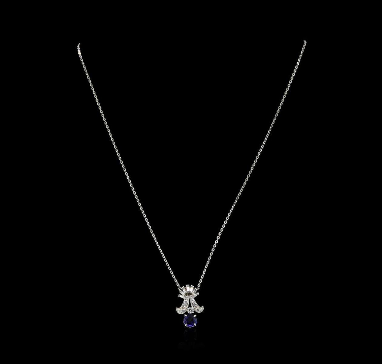 One electronically tested platinum & 14KT white gold ladies cast & assembled sapphire and diamond pendant with chain. The platinum pendant features a free hanging sapphire under a diamond set stylized umbrella, completed by a hidden bail. The pendant is supported by a 14KT white gold chain, terminating in a platinum spring ring clasp. Bright polish finish. Condition is good. Containing: One prong set round mixed cut natural blue sapphire, measuring 6.20 - 6.20 x 3.20 mm, approximate weight of 1.00ct., clarity is slightly included, type II, medium dark, very slightly grayish, blue color, (GIA B 6/3), cut is good. Transmitting light with a minimum of distortion, transparent. Naturally occurring internal & external characteristics are present. Graded in the setting. One prong set round brilliant cut diamond, measuring 2.90 - 2.90 x 1.74mm (depth est.) approximate weight of 0.09ct. Graded in the setting. Clarity I-1. Color: G Ten prong set round brilliant cut diamonds, measuring 1.90 - 1.60 x 1.05mm (depth est.) approximate total weight of 10 Stones = 0.20ct. Graded in the setting. Clarity VS-1 to SI-1. Color: G - H Seven prong set baguette cut (tapered) diamonds, measuring from 2.00 x 1.20 x 0.84mm (depth est.) to 3.00 x 1.30 x 0.91mm (depth est.) approximate total weight of 7 Stones = 0.18ct. Graded in the setting. Clarity VS-1 to SI-1. Color: G - H. Total Weight of Colored Stones 1.00ct.. Total Weight of Diamonds 0.47ct.. Total Weight of Pendant With Chain 5.47gm. AIG Appraised at $3,860.00.
