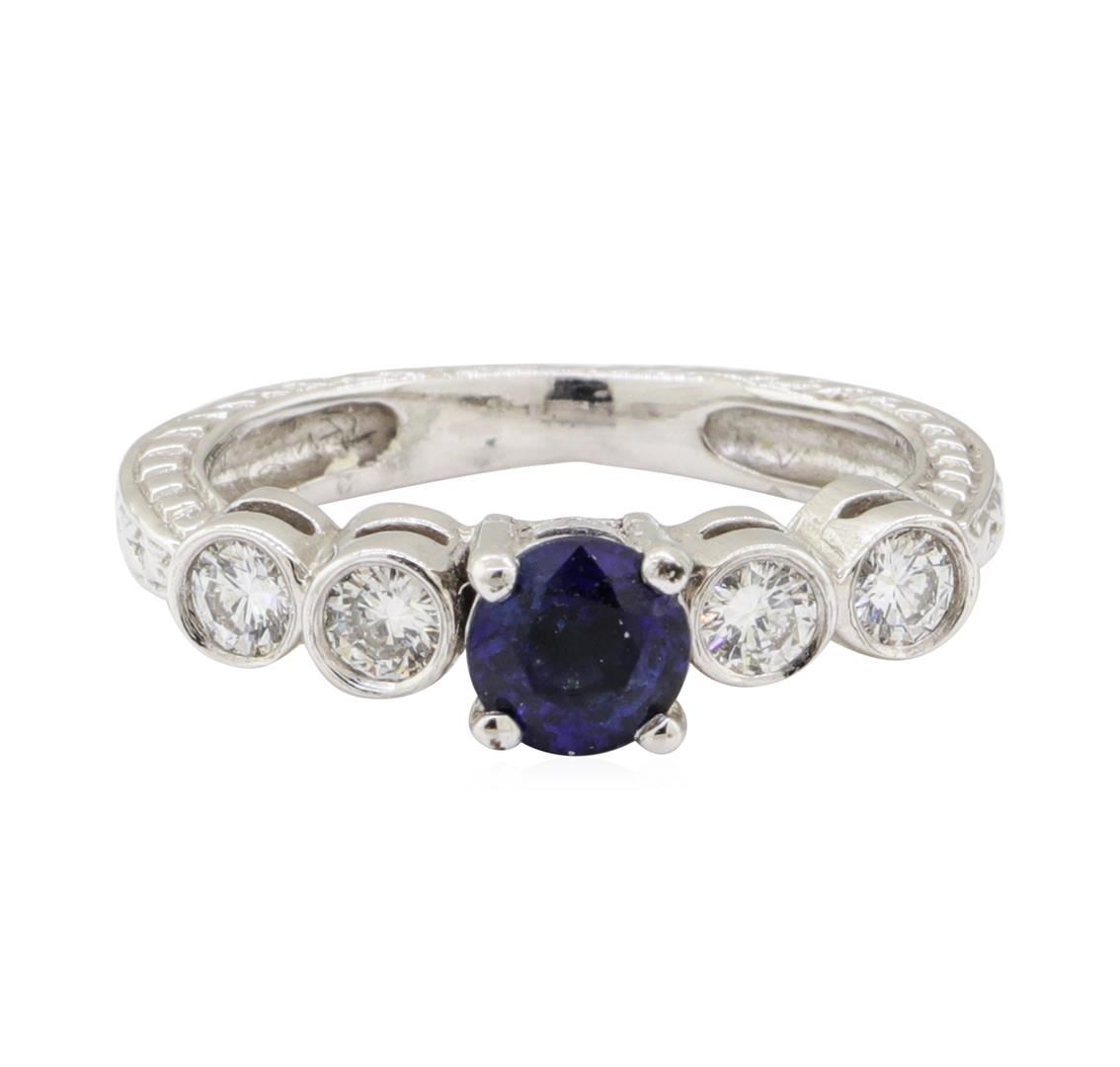 One ring with a hand-engraved vintage motif featuring: 14KT white gold weighing 4.7 grams containing one sapphire weighing 0.60ct and four diamonds weighing 0.40ctw.