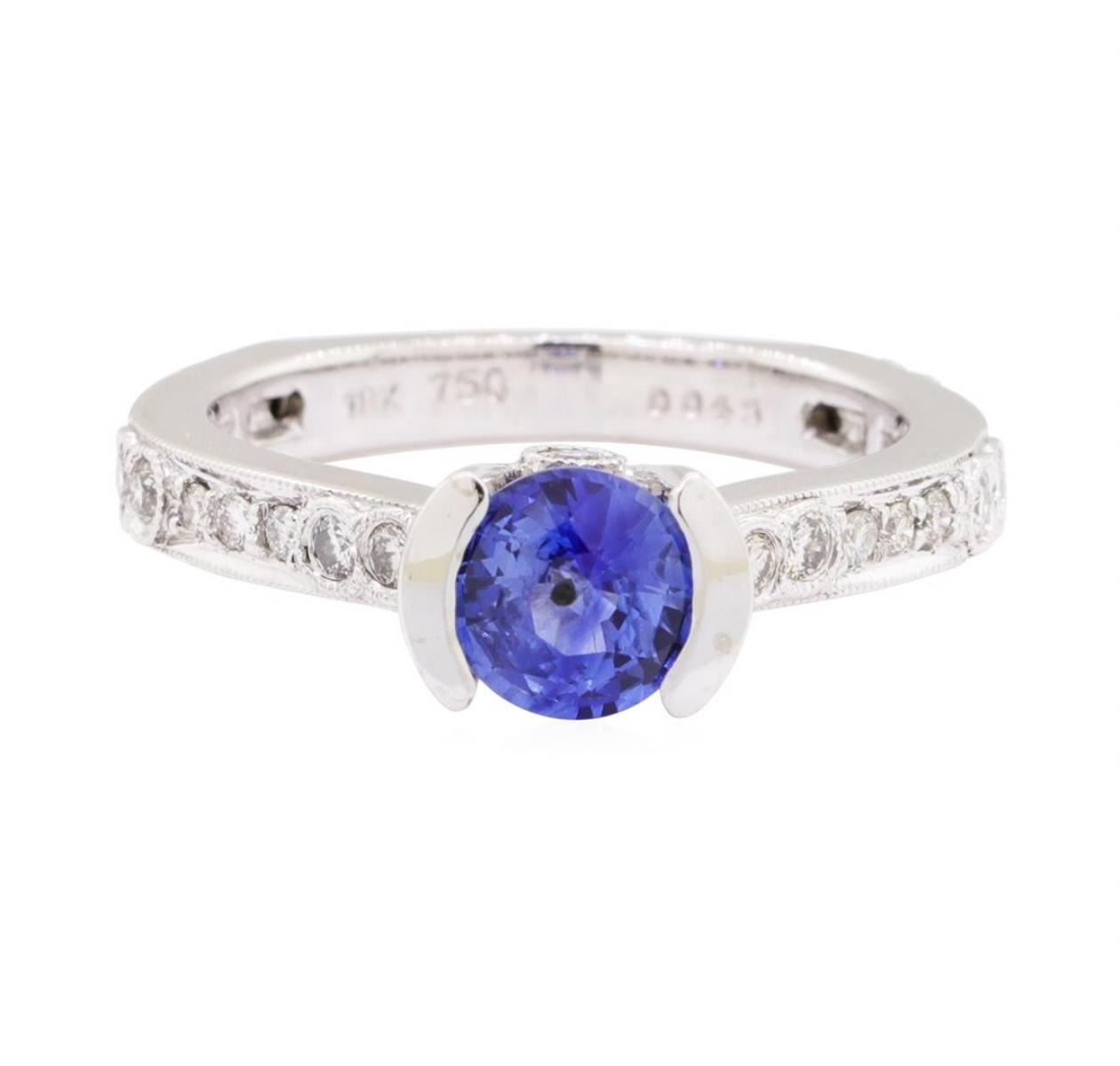 One lady's ring with a Euro shank featuring: 18KT white gold weighing 5.5 grams containing one half-bezel set center sapphire weighing 1.00ct and diamonds weighing 0.45ctw.