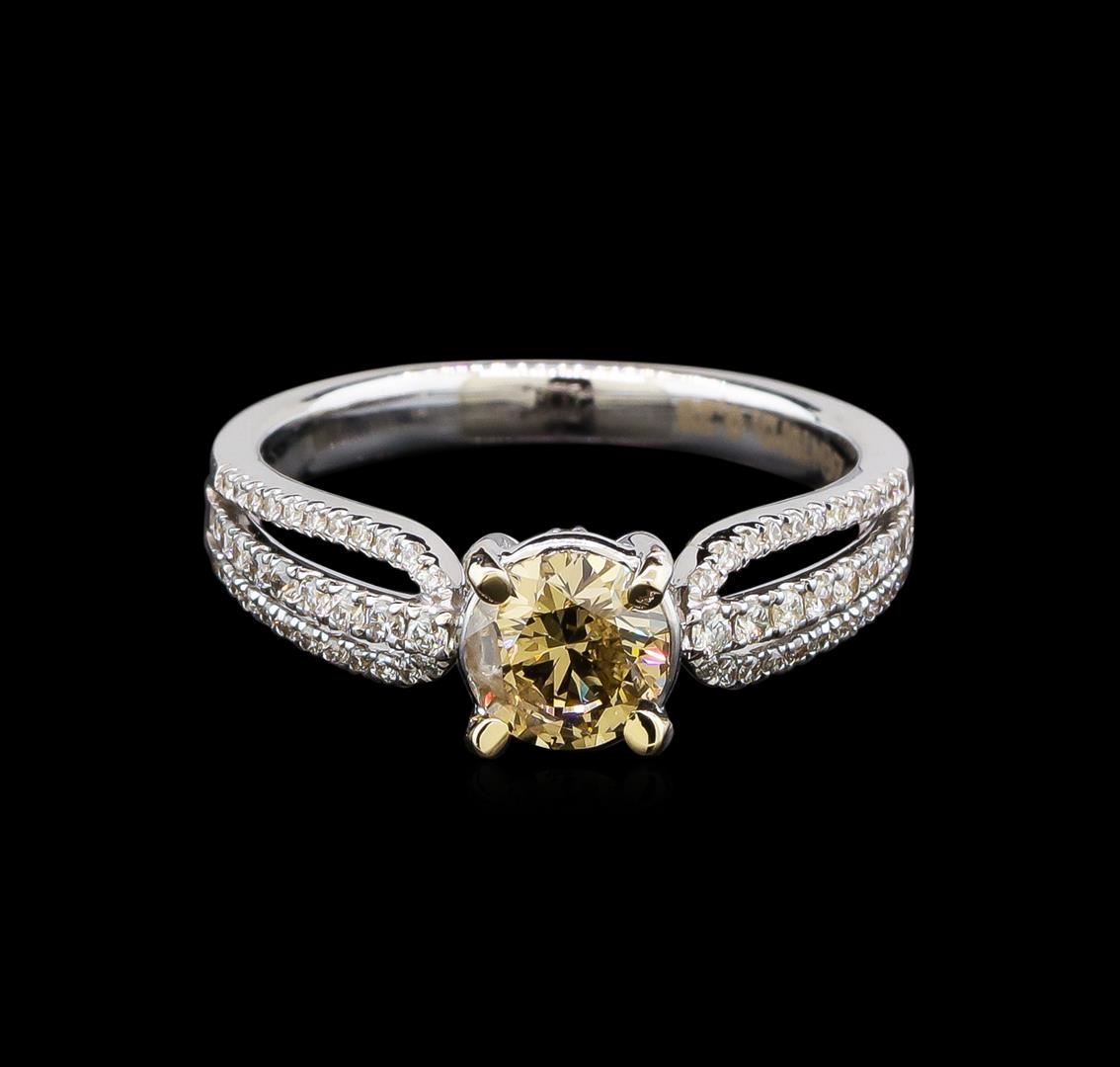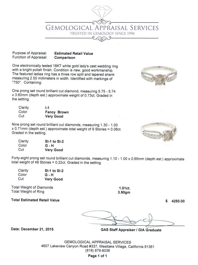 One electronically tested 18KT white gold lady's cast wedding ring with a bright polish finish. Condition is new, good workmanship. The featured ladies ring has a three row split and tapered shank measuring 2.50 millimeters in width. Identified with markings of "750". Containing: One prong set round brilliant cut diamond, measuring 5.75 - 5.74 x 3.60mm (depth est.) approximate weight of 0.73ct. Graded in the setting. Clarity: I-1. Color: Fancy Brown. Cut: Very Good. Nine prong set round brilliant cut diamonds, measuring 1.30 - 1.00 x 0.71mm (depth est.) approximate total weight of 9 stones = 0.06ct. Graded in the setting. Clarity: SI-1 to SI-2. Color: G - H. Cut: Very Good. Forty-eight prong set round brilliant cut diamonds, measuring 1.10 - 1.00 x 0.65mm (depth est.) approximate total weight of 48 Stones = 0.22ct. Graded in the setting. Clarity: SI-1 to SI-2. Color: G - H. Cut: Very Good. Total Weight of Diamonds: 1.01ct. Total Weight of Ring: 3.90gm. GAS Appraised.
