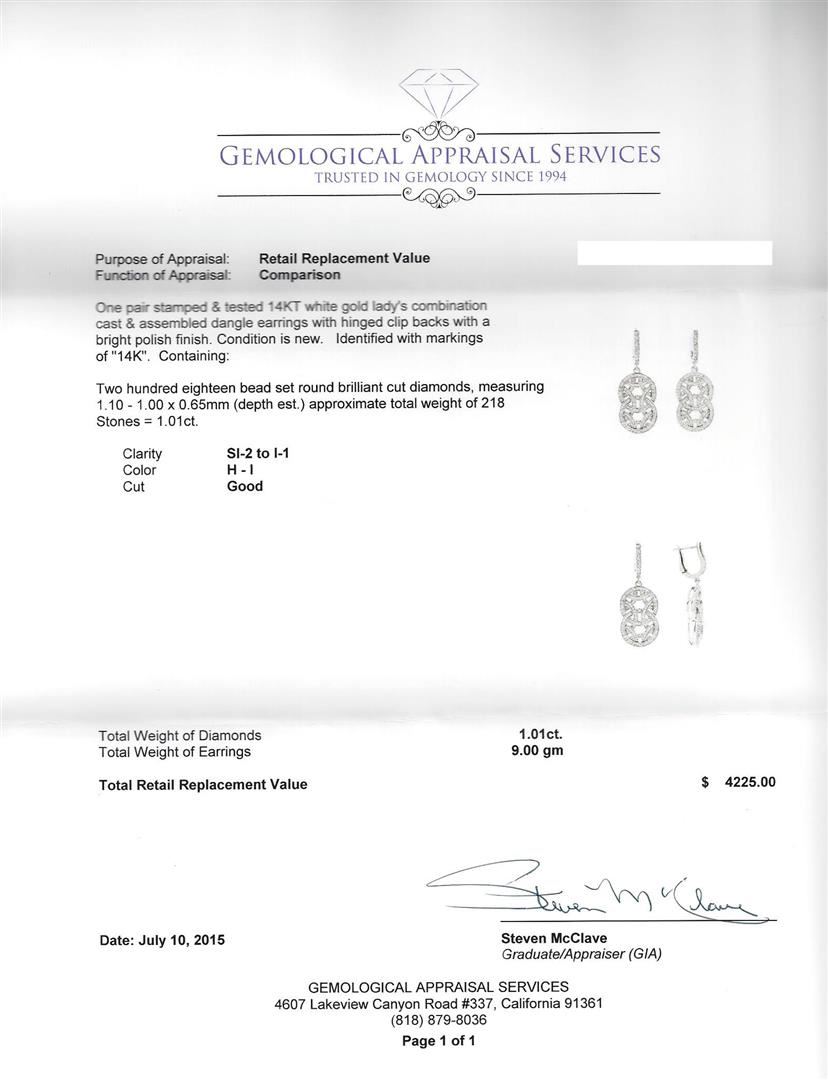 One pair stamped & tested 14KT white gold lady's combination cast & assembled dangle earrings with hinged clip backs with a bright polish finish. Condition is new. Identified with markings of "14K". Containing: Two hundred eighteen bead set round brilliant cut diamonds, measuring 1.10 - 1.00 x 0.65mm (depth est.) approximate total weight of 218 Stones = 1.01ct. Clarity: SI-2 to I-1. Color: H - I. Cut: Good. Total Weight of Diamonds: 1.01ct. Total Weight of Earrings: 9.00 gm. GAS Appraised at $4,225.00.