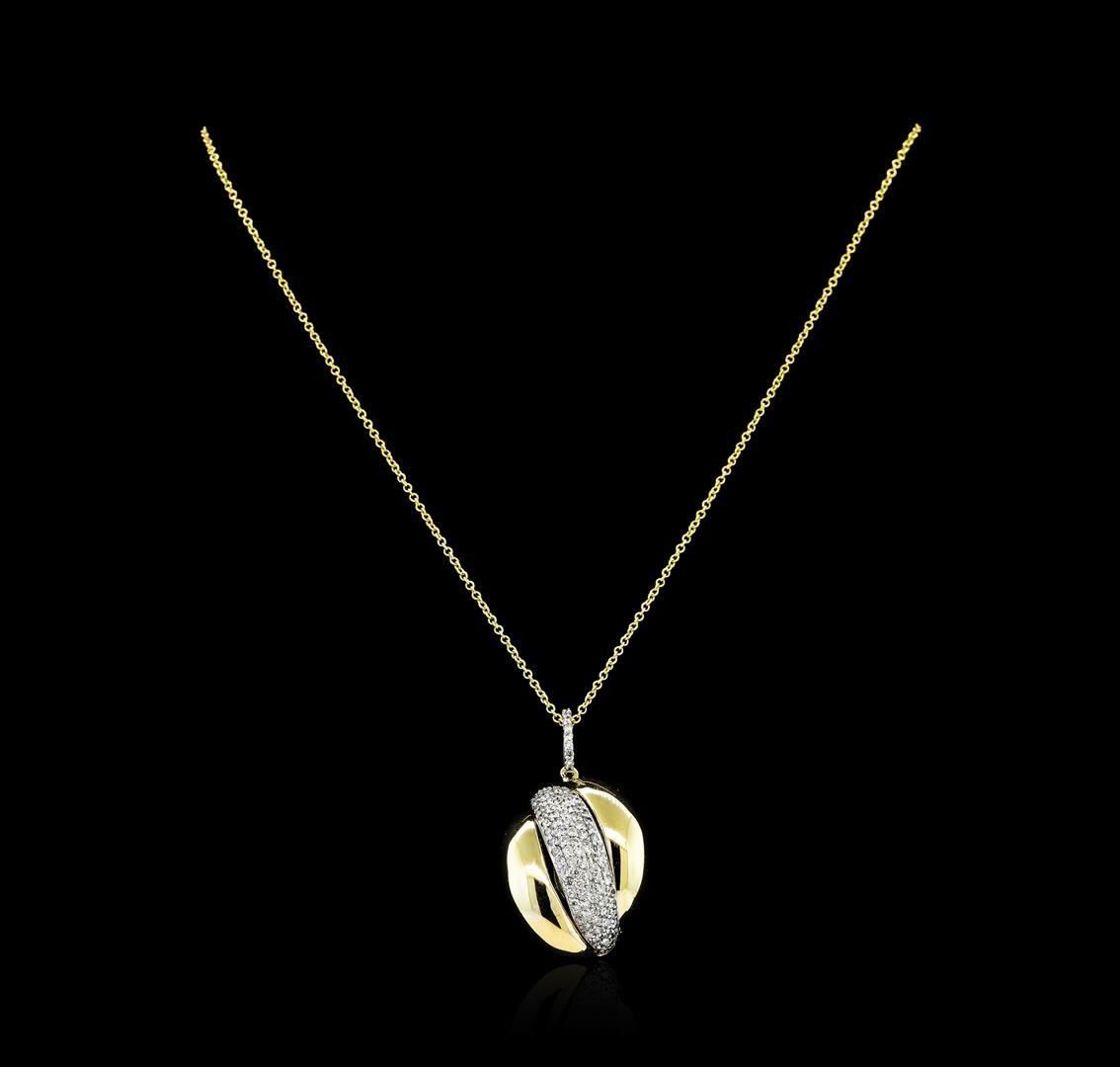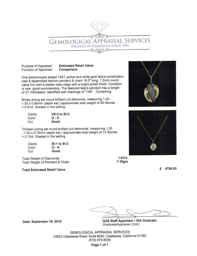 One electronically tested 14KT yellow and white gold lady's combination cast & assembled fashion pendant & chain 18.0' long, 1.3mm round cable link with a lobster claw clasp with a bright polish finish. The featured lady's pendant has a length of 37 millimeters. Identified with markings of '14K'. Condition is new, good workmanship. Containing: Ninety prong set round brilliant cut diamonds, measuring 1.40 - 1.35 x 0.86mm (depth est.) approximate total weight of 90 Stones = 0.91ct. Graded in the setting. Clarity VS-2 to SI-2. Color: G - H Cut Good Thirteen prong set round brilliant cut diamonds, measuring 1.30 - 1.20 x 0.78mm (depth est.) approximate total weight of 13 Stones = 0.10ct. Graded in the setting. Clarity SI-1 to SI-2. Color: G - H Cut Good. Total Weight of Diamonds 1.01ct.. Total Weight of Pendant & Chain 7.30gm. GAS Appraised.
