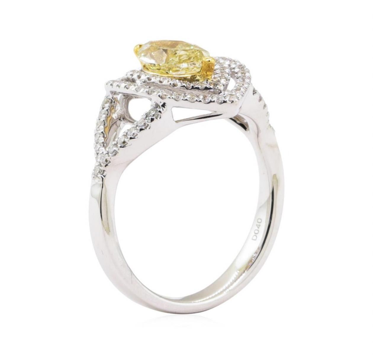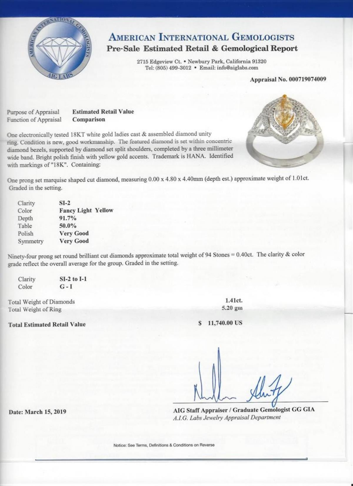 One electronically tested I8KT white gold ladies cast & assembled diamond unity ring. Condition is new, good workmanship The featured diamond is set within concentric diamond bezels, supported by diamond set split shoulders, completed by a three millimeter wide band. Bright polish ?nish with yellow gold accents. Trademark is HANA. Identi?ed with markings of "l8K". Containing: One prong set marquise shaped out diamond, measuring 0.00 x 4.80 X 4.4Omm (depth est.) approximate weight of 1.01ct Graded in the setting. Clarity SI-2 Color Fancy Light Yellow Depth 91.7% Table 50.0% Polish Very Good Symmetry Very Good Ninety-four prong set round brilliant cut diamonds approximate total Weight of 94 Stones I 0.40 ct. The clarity & color grade re?ect the overall average for the group. Graded in the setting. Clarity SI-2 to I-1 Color G - I Total Weight of Diamonds 1.41ct. Total Weight of Ring 5.20 gm Total Estimated Retail Value $ 11,740.00 US