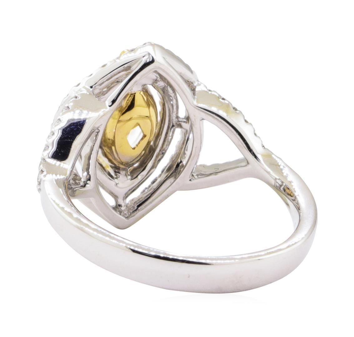 One electronically tested I8KT white gold ladies cast & assembled diamond unity ring. Condition is new, good workmanship The featured diamond is set within concentric diamond bezels, supported by diamond set split shoulders, completed by a three millimeter wide band. Bright polish ?nish with yellow gold accents. Trademark is HANA. Identi?ed with markings of "l8K". Containing: One prong set marquise shaped out diamond, measuring 0.00 x 4.80 X 4.4Omm (depth est.) approximate weight of 1.01ct Graded in the setting. Clarity SI-2 Color Fancy Light Yellow Depth 91.7% Table 50.0% Polish Very Good Symmetry Very Good Ninety-four prong set round brilliant cut diamonds approximate total Weight of 94 Stones I 0.40 ct. The clarity & color grade re?ect the overall average for the group. Graded in the setting. Clarity SI-2 to I-1 Color G - I Total Weight of Diamonds 1.41ct. Total Weight of Ring 5.20 gm Total Estimated Retail Value $ 11,740.00 US
