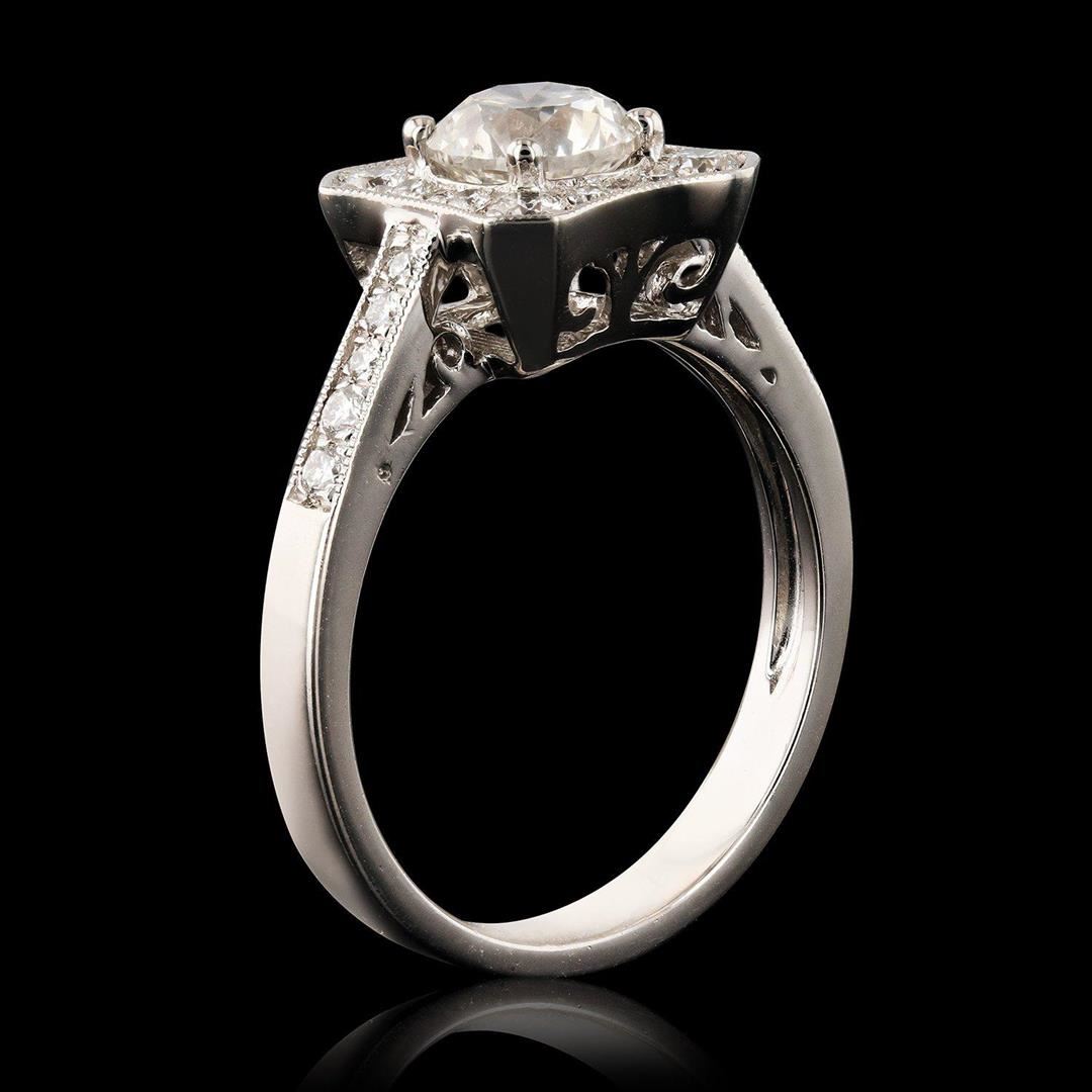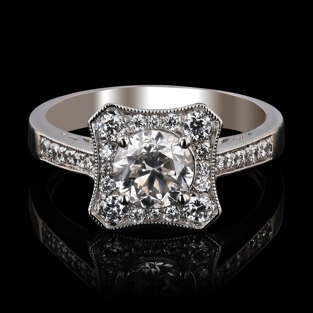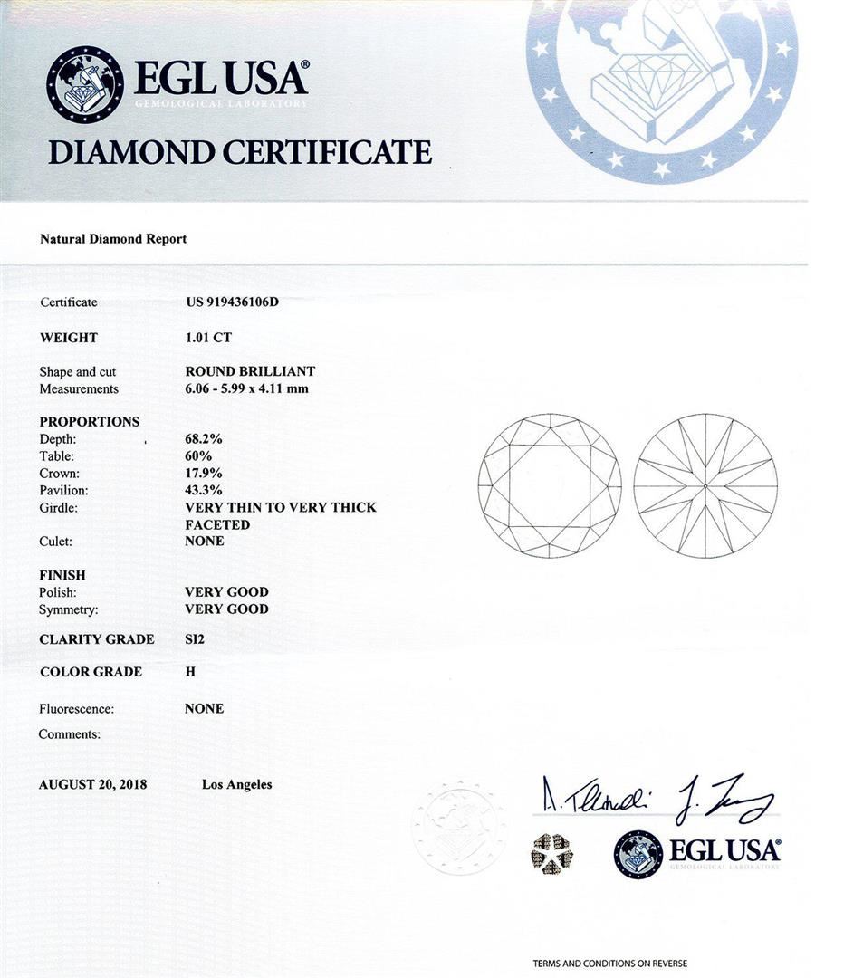 Platinum Diamond Ring One polished, stamped, and tested platinum ring with a bright finish. The ring is mounted with 1 genuine EGL certified diamond center stone weighing 1.01 carat, and 26 genuine round diamonds weighing approximately 0.35 carats. This item weighs 7.2 grams, condition is new, excellent workmanship. MAIN GEMSTONE EGL Report No.: US 919436106D Identity: Natural Diamond Shape: Round Cutting Style: Brilliant Cut Measurements: 6.06 - 5.99 x 4.11mm Weight: 1.01 carat Color Grade: H Clarity Grade: SI2 Polish: Very Good Symmetry: Very Good Refractive Index: 2.417 Hardness: 10 ADJACENT GEMSTONES ON RING Identity: Natural Diamond Shape: Round Cutting Style: Brilliant Cut Quantity: 26 Diamonds Measurements: 1.2 - 2.0mm Total Weight: 0.35 carats Color Grade: F - G Clarity Grade: SI1 to SI2 Refractive Index: 2.418 Hardness: 10 CENTER DIAMOND WEIGHT: 1.01ct TOTAL DIAMOND WEIGHT: 1.36ctw WEIGHT OF ITEM: 7.2 grams METAL: Platinum