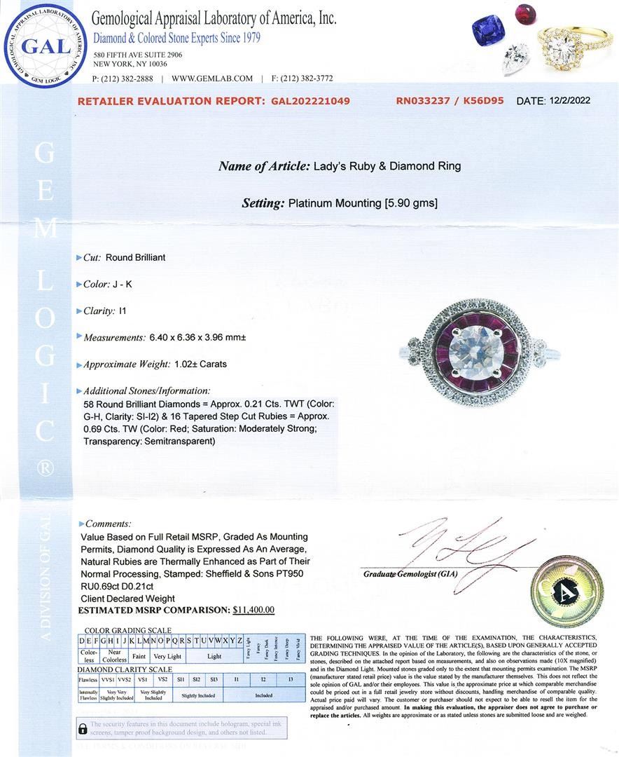1.02ct CENTER Diamond and 0.69ctw Ruby Platinum Ring (1.23ctw Diamonds). Name of Article: Lady's Ruby and Diamond Ring Setting: Platinum Mounting [5.90 gms] Cut: Round Brilliant Color: J - K Clarity: I1 Measurements: 6.40 x 6.36 x 3.96mm Approximate Weight: 1.02 Carats Additional Stones/Information: 58 Round Brilliant Diamonds = Approx. 0.21 Cts. TWT (Color: G-H, Clarity: SI-I2) and 16 Tapered Step Cut Rubies = Approx. 0.69 Cts. TW (Color: Red Saturation: Moderately Strong Transparency: Semitransparent)