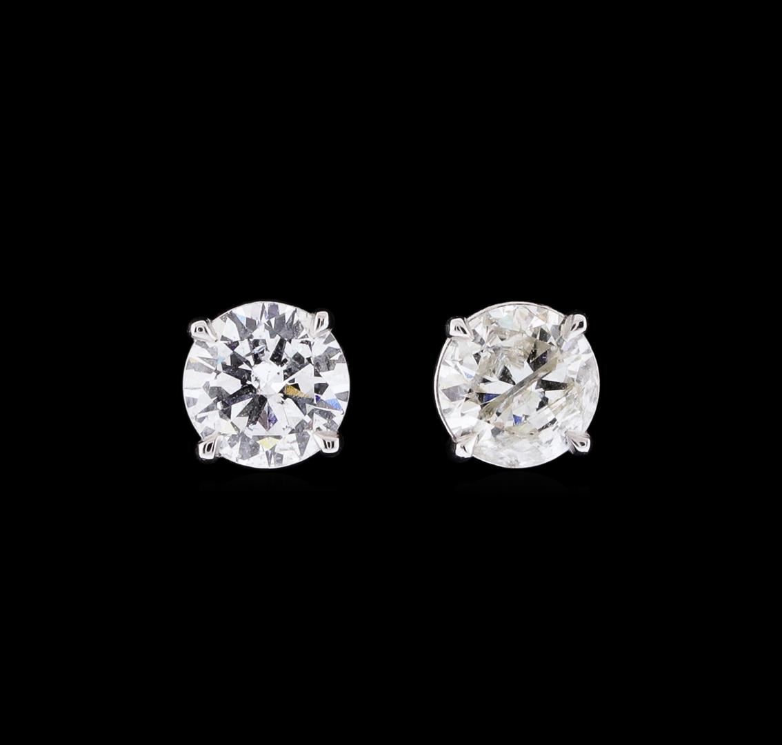One pair electronically tested 14KT white gold lady's cast stud earrings with friction posts with a basket setting with a bright polish finish. Identified with markings of '14K'. Condition is new, good workmanship. Containing: One prong set round brilliant cut diamond, measuring 5.19 - 5.15 x 3.15mm (depth est.) approximate weight of 0.52ct. Graded in the setting. Clarity SI-2. Color: H Cut Good One prong set round brilliant cut diamond, measuring 5.08 - 5.05 x 3.18mm (depth est.) approximate weight of 0.50ct. Graded in the setting. Clarity I-2. Color: J Cut Good. Total Weight of Diamonds 1.02ct.. Total Weight of Earrings 1.00gm. GAS Appraised.