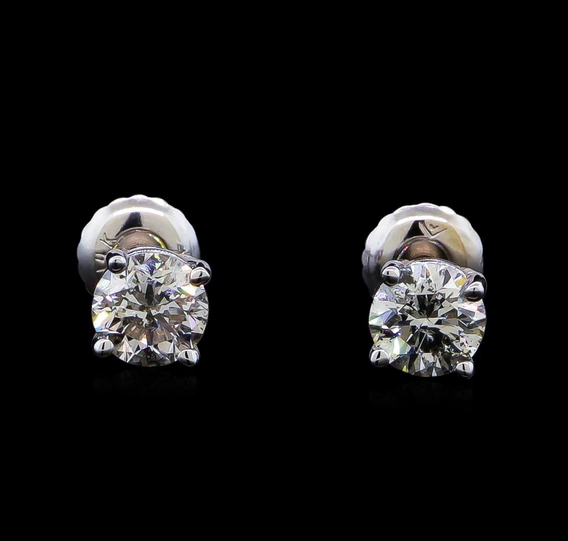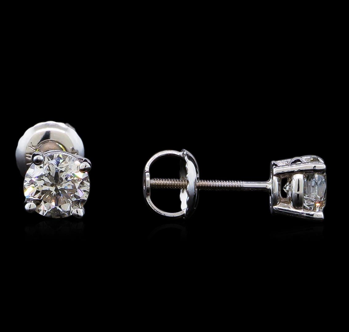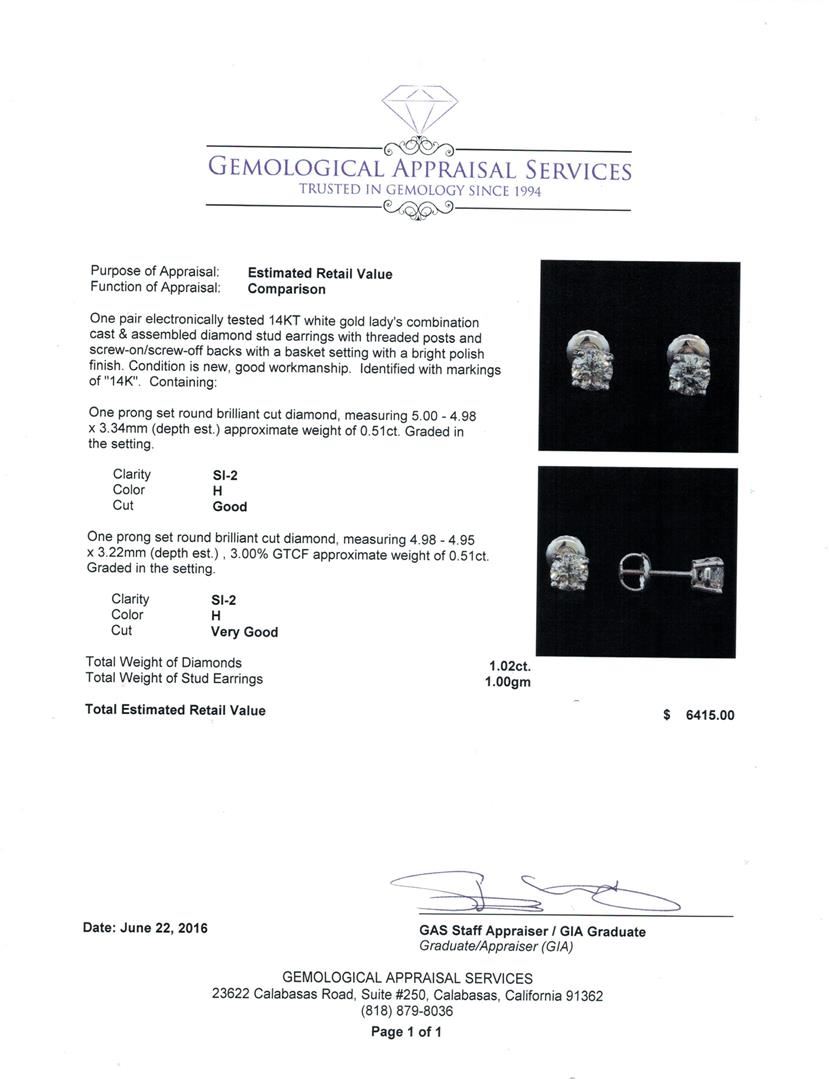 One pair electronically tested 14KT white gold lady's combination cast & assembled diamond stud earrings with threaded posts and screw-on/screw-off backs with a basket setting with a bright polish finish. Identified with markings of "14K". Condition is new, good workmanship. Containing: One prong set round brilliant cut diamond, measuring 5.00 - 4.98 x 3.34mm (depth est.) approximate weight of 0.51ct. Graded in the setting. Clarity: SI-2. Color: Good One prong set round brilliant cut diamond, measuring 4.98 - 4.95 x 3.22mm (depth est.) , 3.00.%. GTCF approximate weight of 0.51ct. Graded in the setting. Clarity: SI-2. Color: Very Good. Total Weight of Diamonds 1.02ct. Total Weight of Stud Earrings 1.00gm. GAS Appraised at $6,415.00.