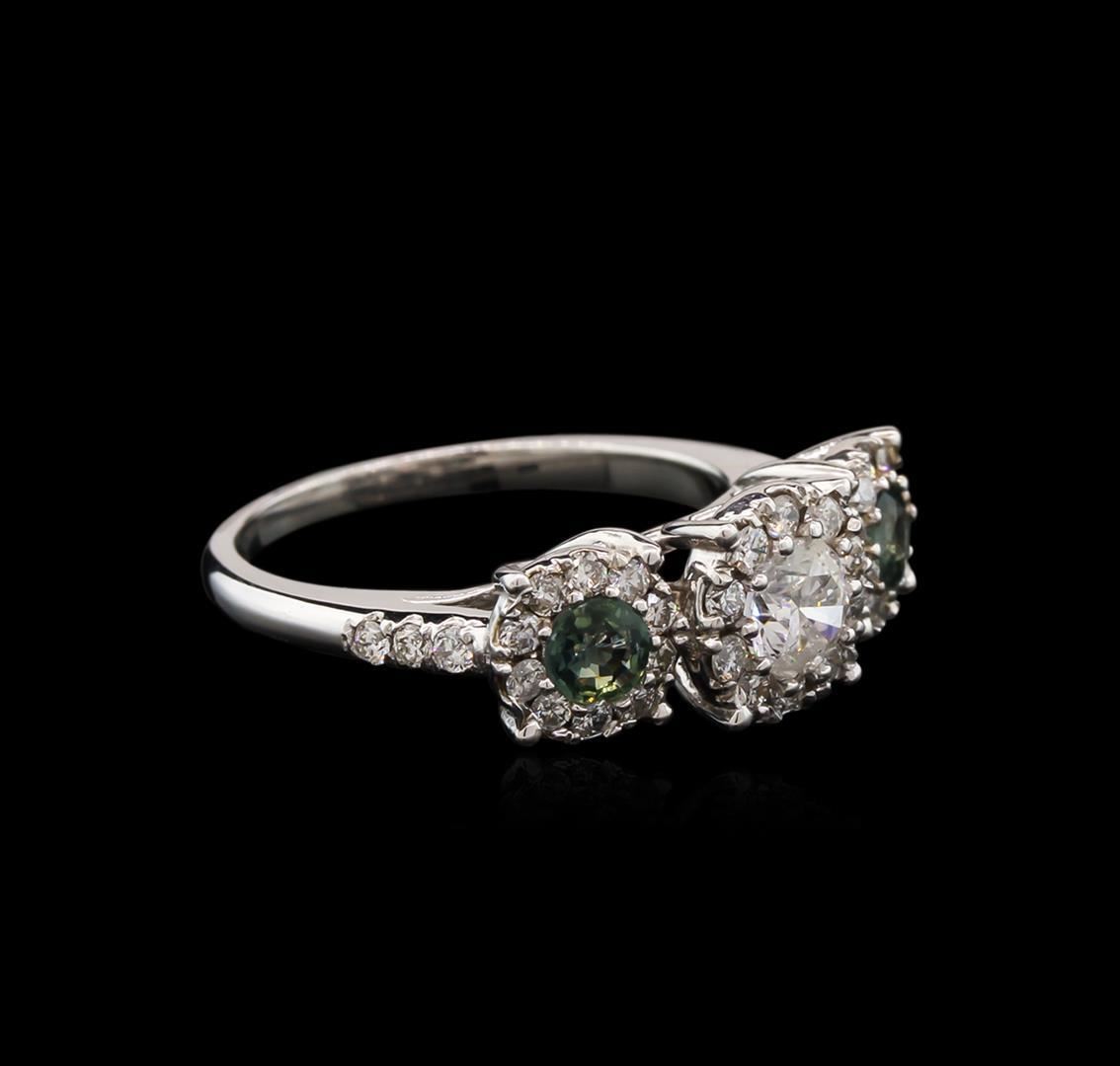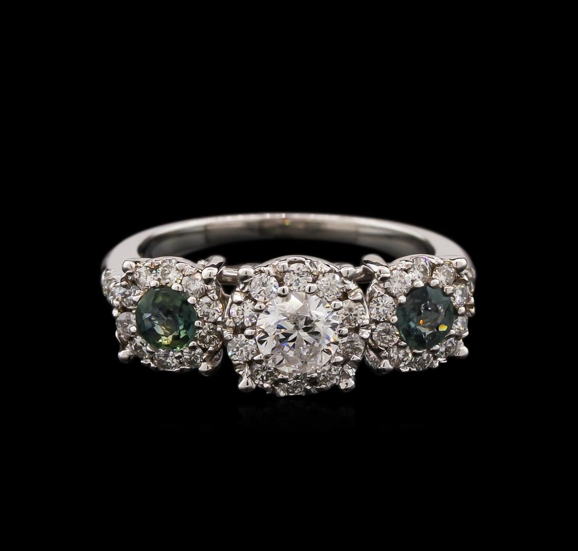 One electronically tested 14KT white gold lady's cast 3-stone ring with a bright polish finish. The featured lady's ring has a shank measuring 1.60 millimeters wide. Identified with markings of "K14". Condition is new, good workmanship. Containing: One prong set round brilliant cut diamond, measuring 5.10 - 5.00 x 3.00mm (depth est.) approximate weight of 0.45ct. Graded in the setting. Clarity: I-1. Color: I. Cut Good Thirty-Six prong set round brilliant cut diamonds, measuring 1.60 - 1.55 x 1.03mm (depth est.) approximate total weight of 36 Stones = 0.57ct. Graded in the setting. Clarity: SI-1 to I-1. Color: H - I. Cut Good Two prong set round modified mixed cut natural blue sapphires, measuring 3.90 - 3.80 x 2.00 mm, approximate total weight of 0.51ct., clarity is eye clean, type II, medium light, very slightly grayish, greenish blue color, (GIA gB 4/3), cut is very good. Colored gemstones are presumed to have been subjected to commonly used enhancement processes. Graded in the setting. Total Weight of Colored Stones 0.51ct. Total Weight of Diamonds 1.02ct. Total Weight of Ring 4.20gm. GAS Appraised.