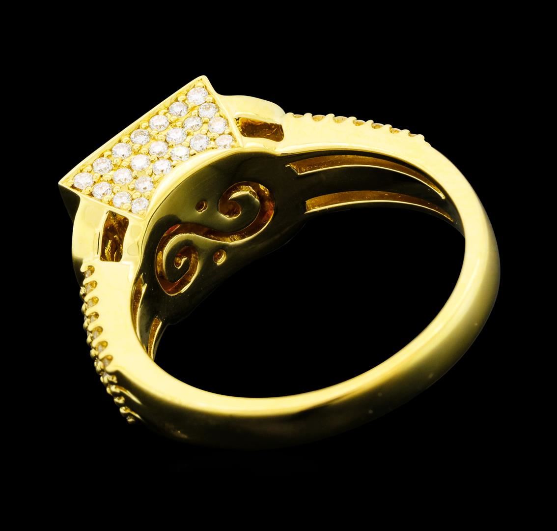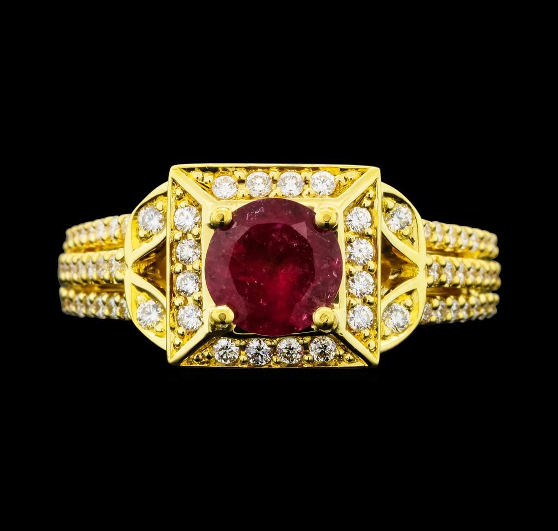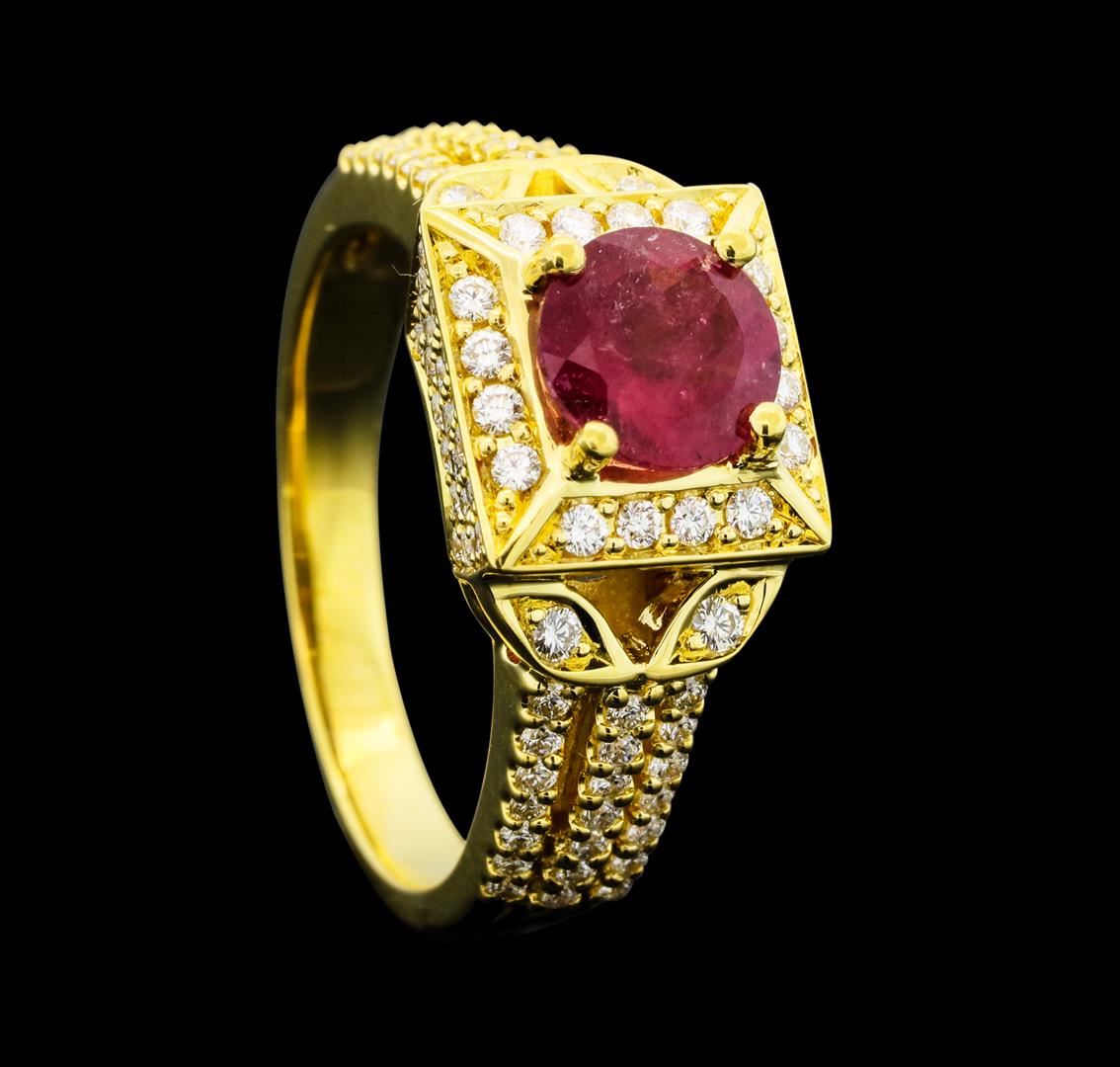 One electronically tested 18KT yellow gold lady's cast fashion ring with a split cathedral shank with a halo with a bright polish finish. The featured lady's ring has a shank measuring 2.63 millimeters wide. Identified with markings of '18K'. Condition is new, good workmanship. Containing: One prong set round modified brilliant cut natural pink tourmaline, measuring 6.51 - 6.48 x 4.11 mm, (depth est.) approximate weight of 1.02ct., clarity is heavily included, medium, moderately strong, slightly purplish red color, (GIA slpR 5/4), cut is good. Transmitting light somewhat diffusely, semi-transparent to translucent. Naturally occurring internal & external characteristics are present. Colored gemstones are presumed to have been subjected to commonly used enhancement processes. Graded in the setting. Twenty prong set round brilliant cut diamonds, measuring 1.50 - 1.35 x 0.89mm (depth est.) approximate total weight of 20 Stones = 0.22ct. Graded in the setting. Color H - I Clarity VS-1 to VS-2 Cut Very Good Eighty-Six prong set round brilliant cut diamonds, measuring 1.20 - 1.10 x 0.71mm (depth est.) approximate total weight of 86 Stones = 0.48ct. Graded in the setting. Color G - I Clarity VS-1 to SI-1 Cut Very Good. Total Weight of Colored Stones 1.02ct.. Total Weight of Diamonds 0.70ct.. Total Weight of Ring 7.60gm. GAS Appraised.